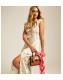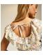 Design: tile print, ruffle trims, hem slit, back neck ties