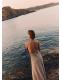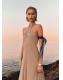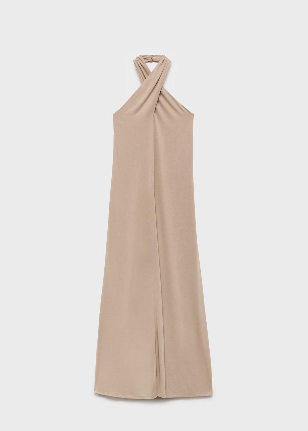 Diseño largo. Diseño evasé. Cuello halter. Cuello cruzado. Sin mangas. Espalda abierta. Cierre de botones en el cuello. Largo de costado 117.0 cm. Largo de la espalda 108.8 cm