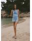 Tejido 100% algodón. Diseño corto. Diseño recto. Detalle de strass. Tiro medio. Cintura con goma elástica. Lazo ajustable. Sin cierre. Total look