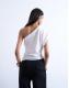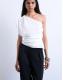 This top is crafted from a textured woven fabric. It is a one-shoulder style with a short sleeve, drape details, asymmetric hem and a regular fit.