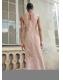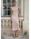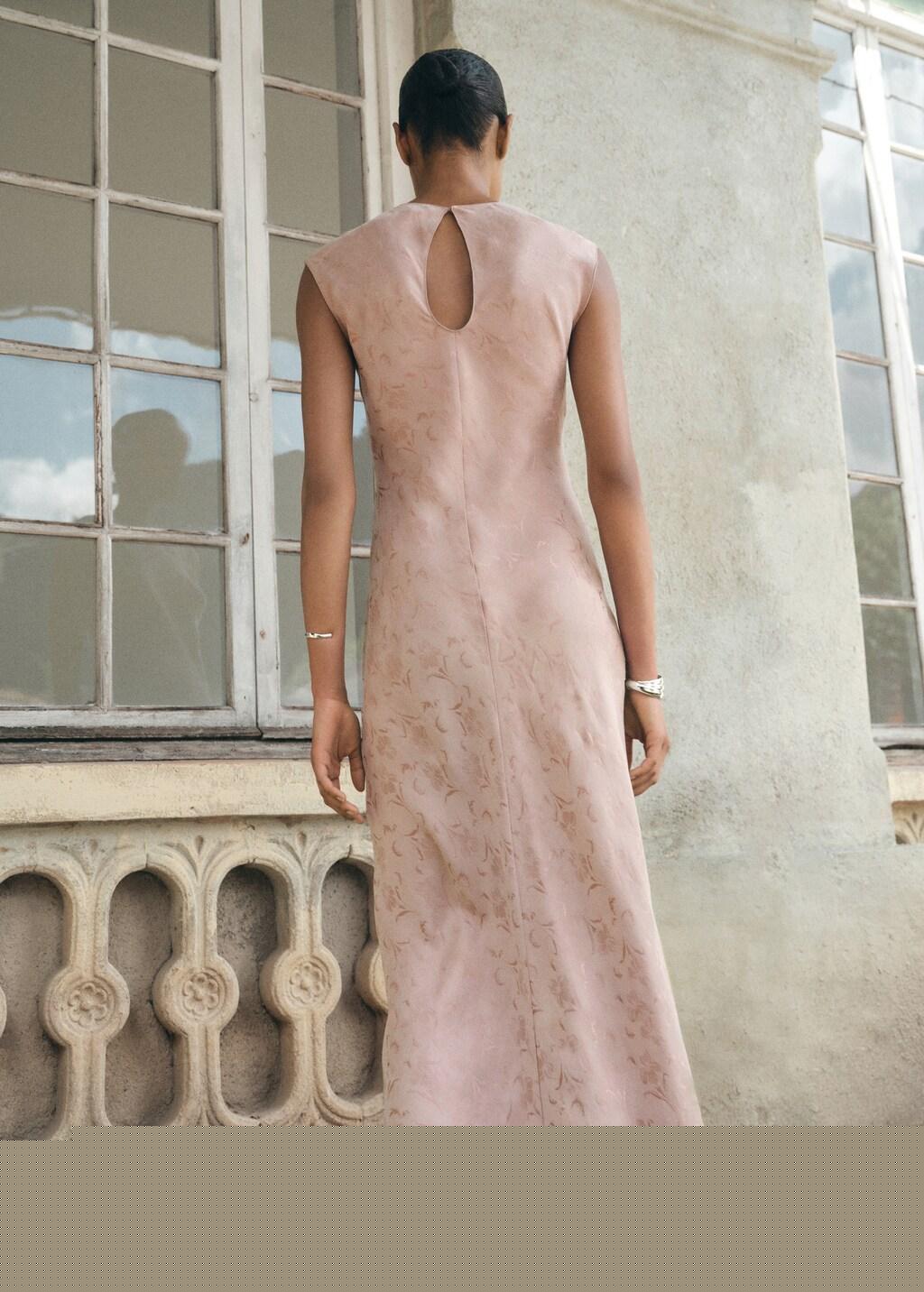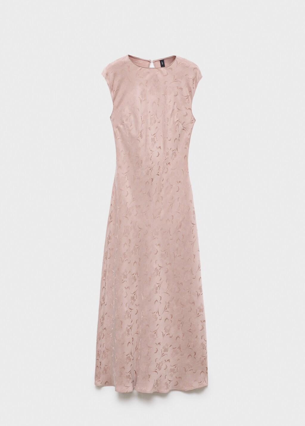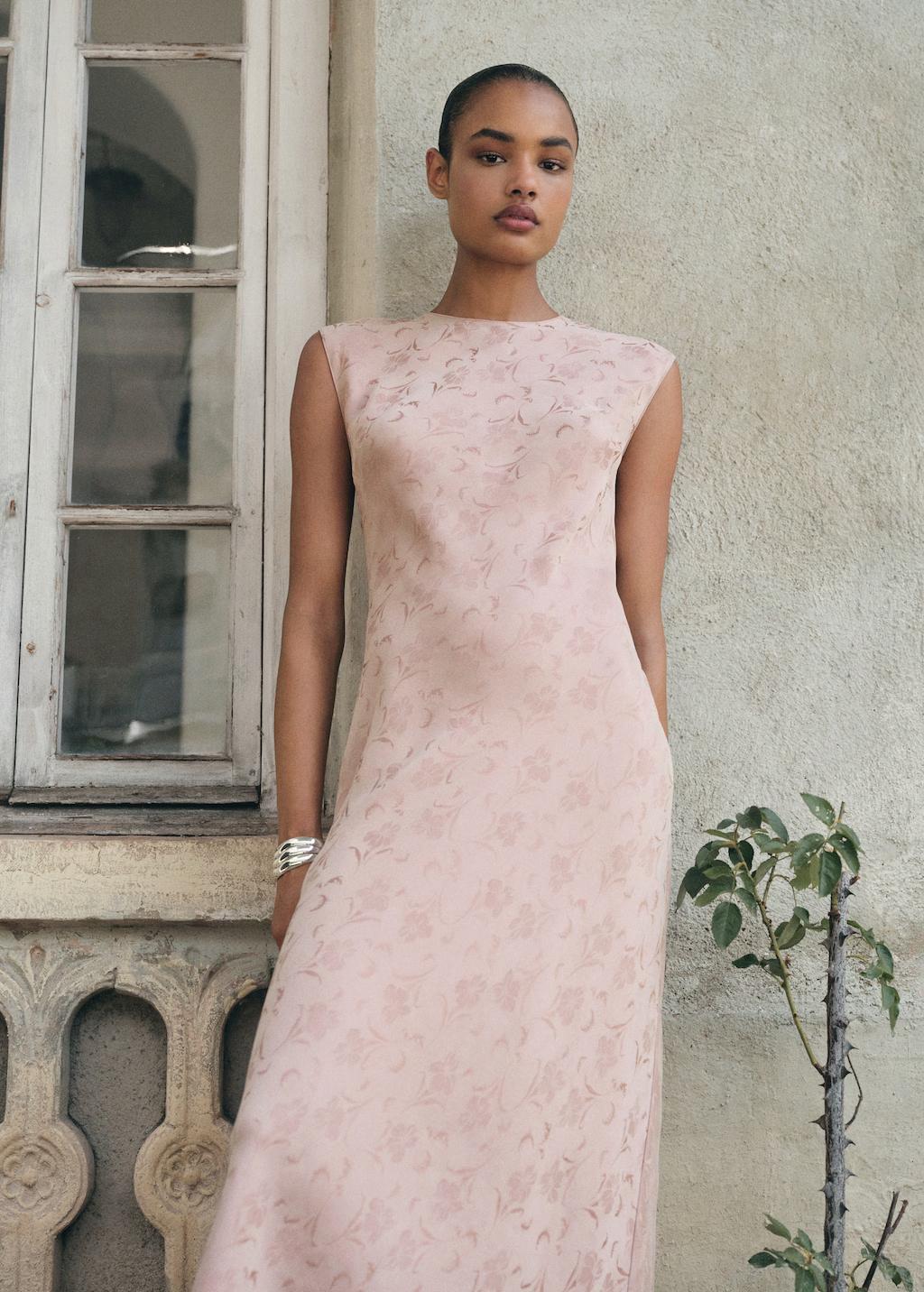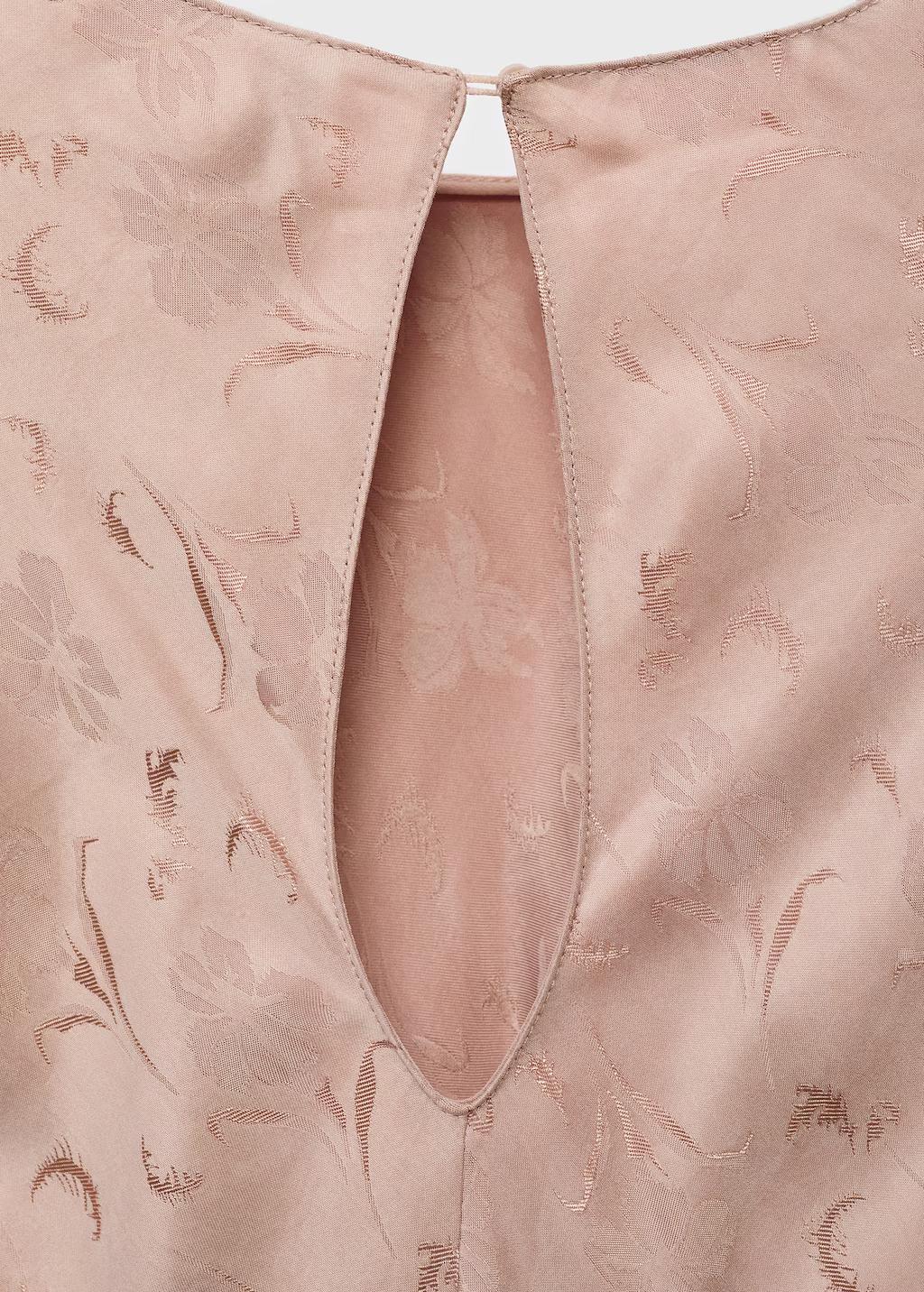 Tejido con acabado satinado. Diseño midi. Diseño recto. Cuello caja. Manga corta. Detalles florales. Cierre de botón en el cuello. El color rosa es exclusivo online