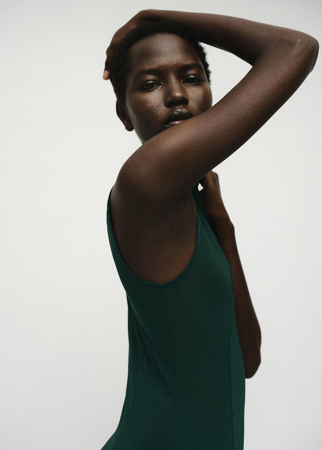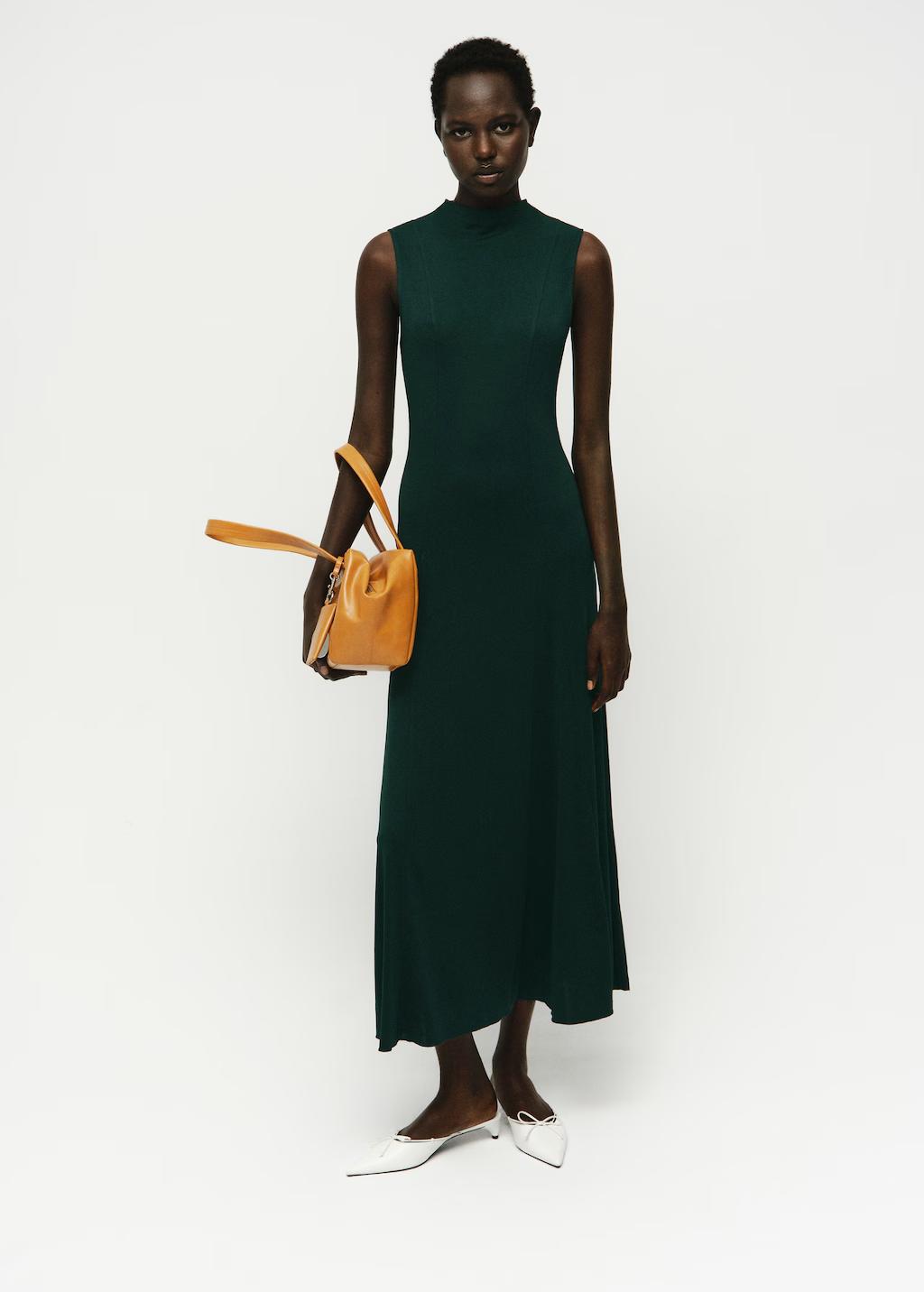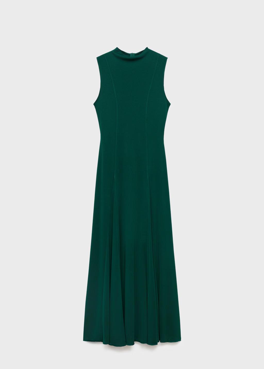 Diseño midi. Diseño evasé. Cuello perkins. Sin mangas. Tirantes anchos. Detalle godets. Cierre de cremallera en la parte posterior