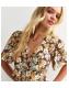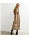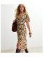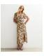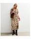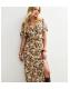 This charming brown and yellow floral print midi dress is is trimmed with a voluminous ruffle to separate the slender bodice from the flowy slit-hem skirt.