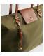 Design: faux leather magnetic tab, logo plaque, knotted bag charm