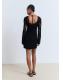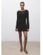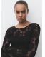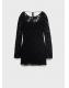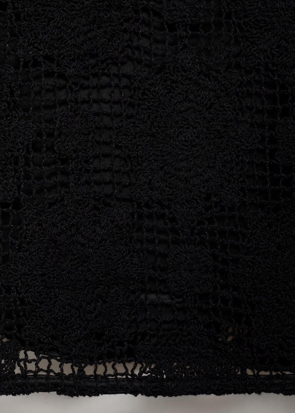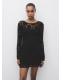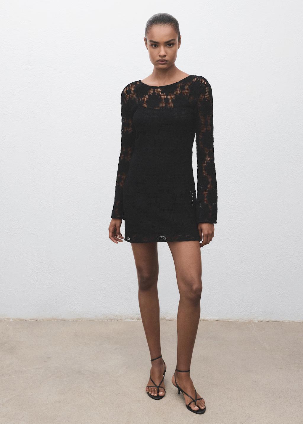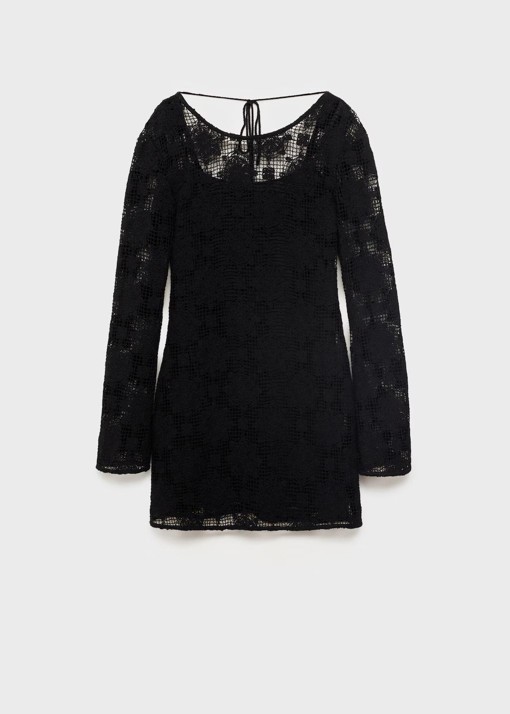 Tejido de crochet. Diseño corto. Cuello redondo. Manga larga acampanada. Espalda abierta. Cierre de lazo en la espalda. Forro interior