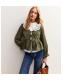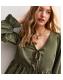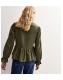 This corduroy khaki tie front top has a flattering peplum fit and puff sleeves. Perfect for wearing on its own or for styling with other pieces. Sold as a single top.