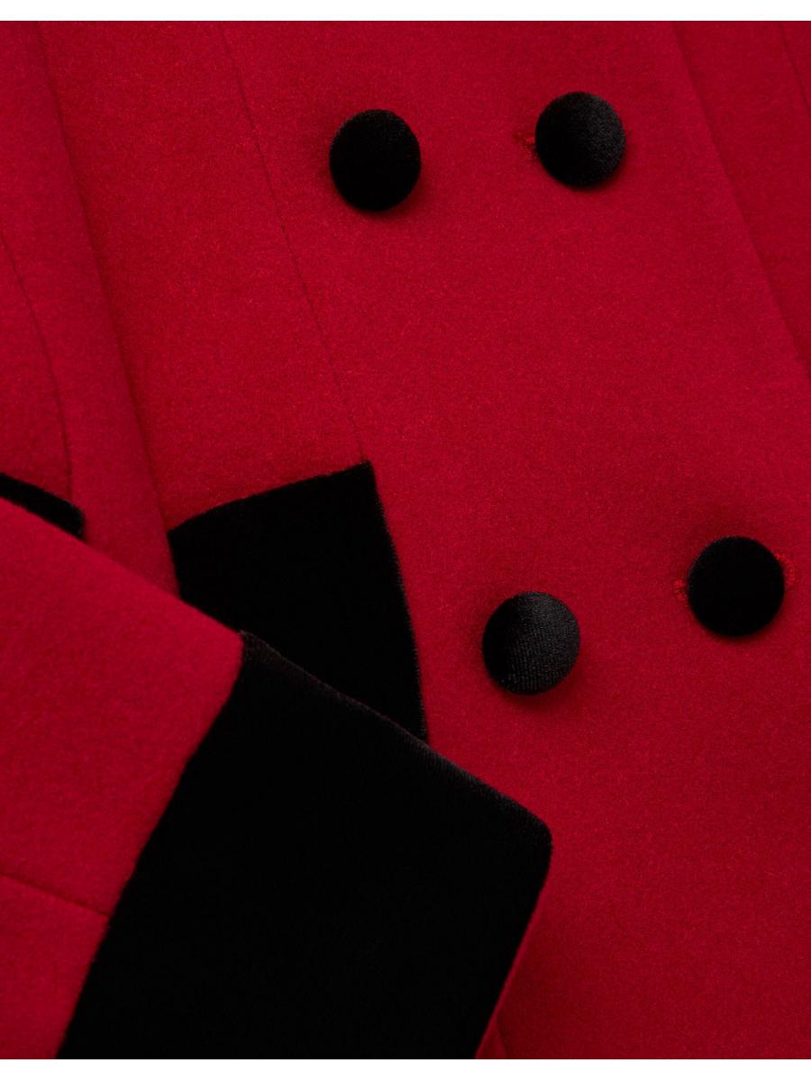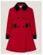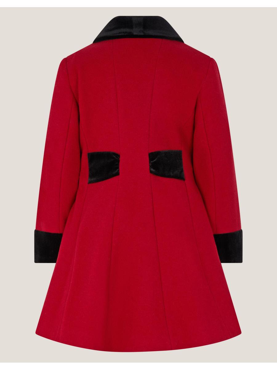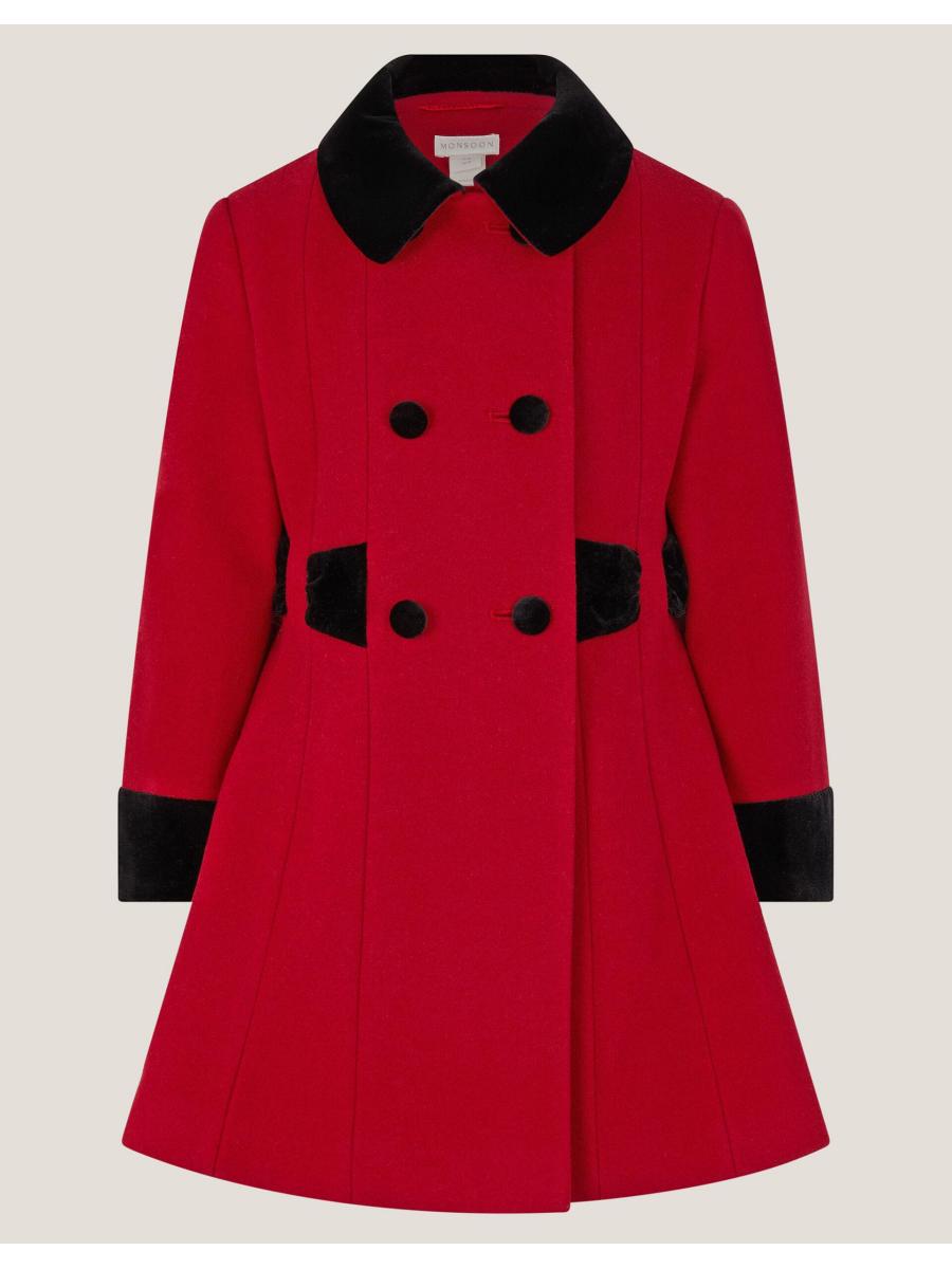 Colour pop! A standout addition to their winter wardrobe, this coat is designed in a striking red hue with contrasting velvet accents to finish. Complete with double-breasted buttons to the front. Red