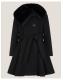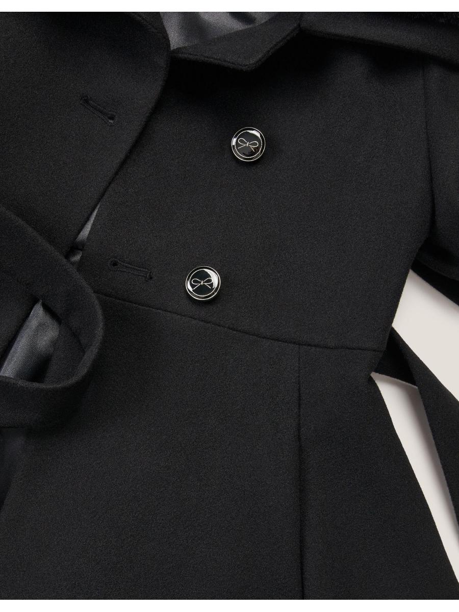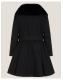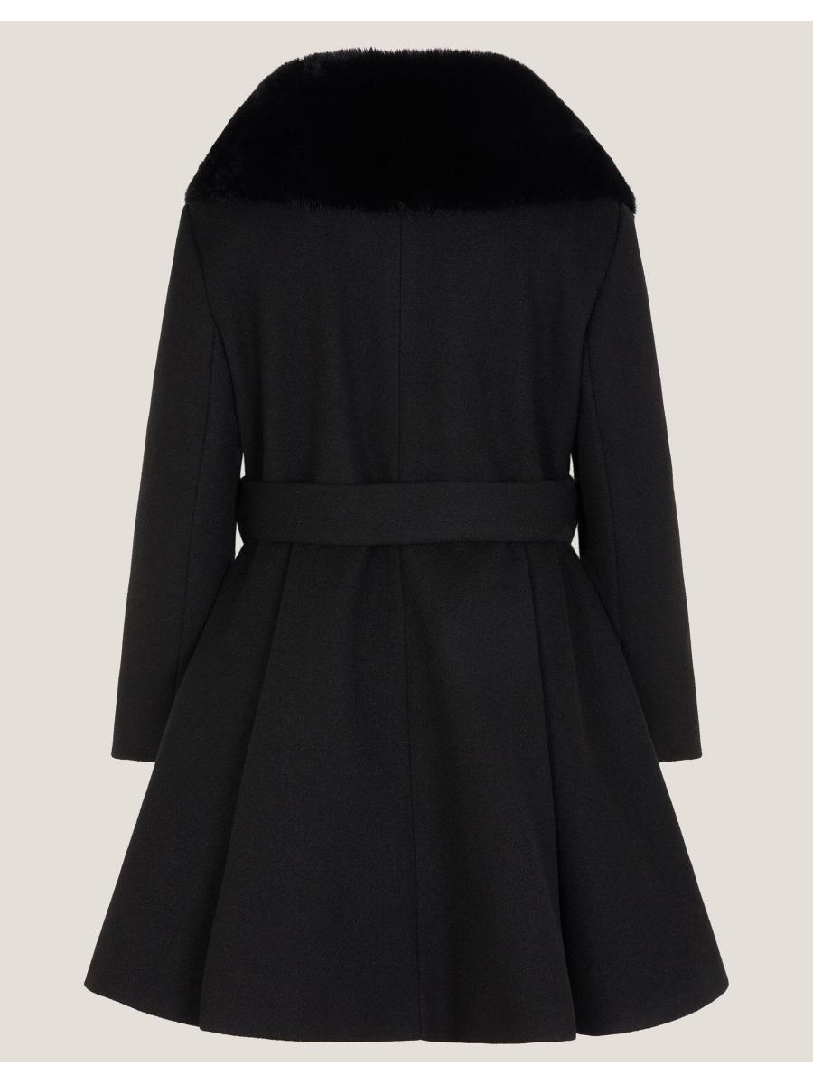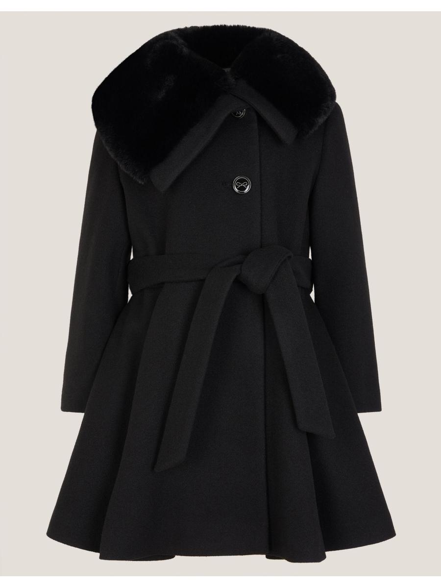 All bundled up. Designed in a neutral hue, this gorgeous dress coat features button fastenings with intricate bow detailing. Finished with a statement faux fur collar and tie belt. Black