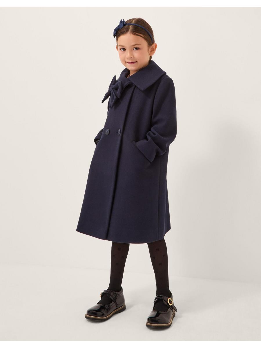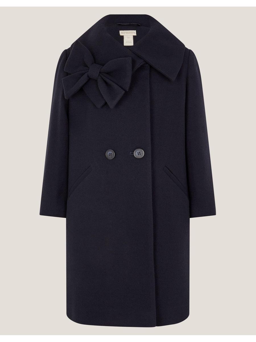 Grab your coat and let's go! Perfect for school runs, this beautiful (and practical) coat features a decorative bow on the oversized collar and button detailing to the waist. Finished with side pockets. Blue