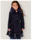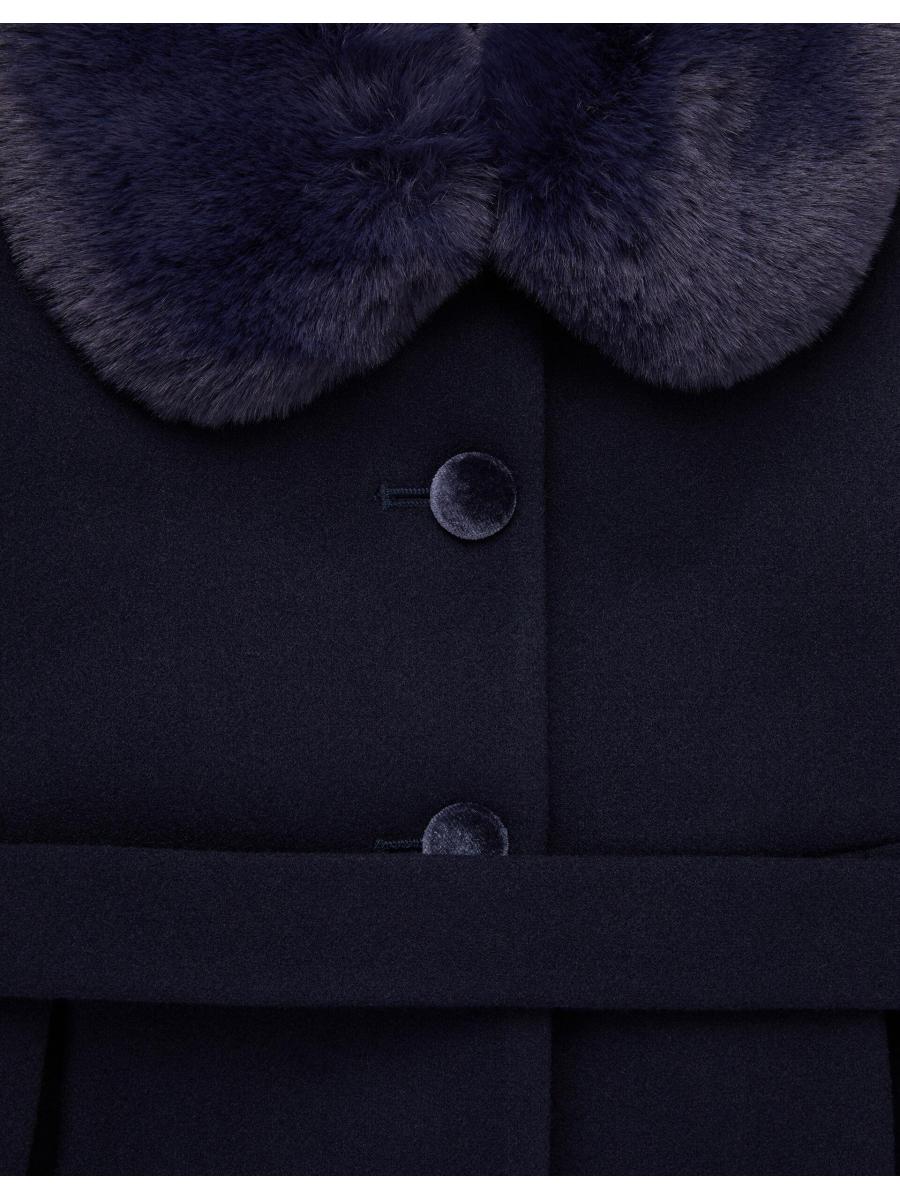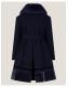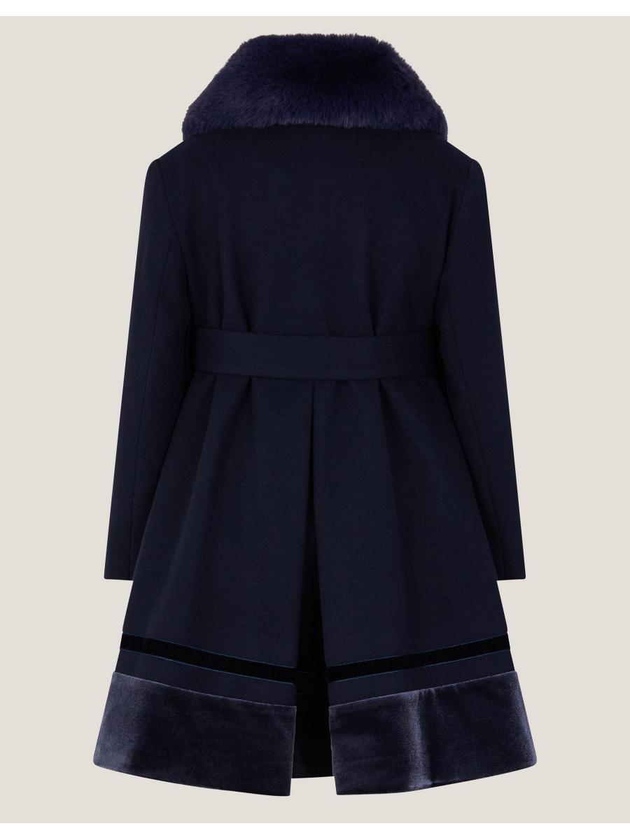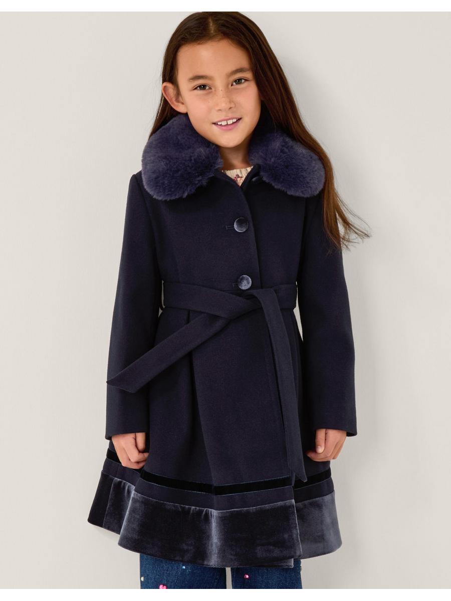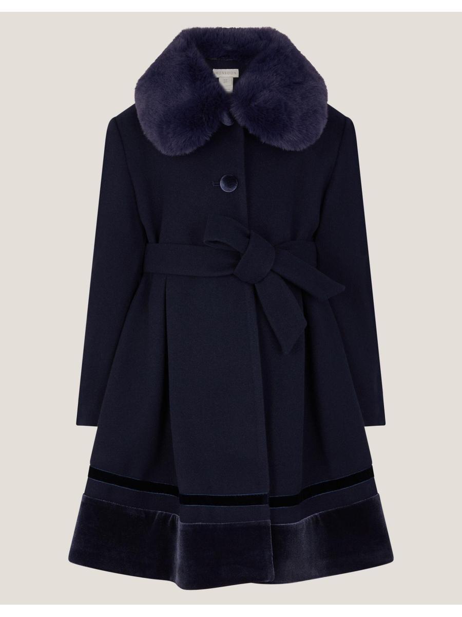 Too chic for words! Designed in a classic navy blue hue, this gorgeous coat features a shiny velvet trim with button fastenings to match. Finished with a detachable faux fur collar and tie detail to front. Blue
