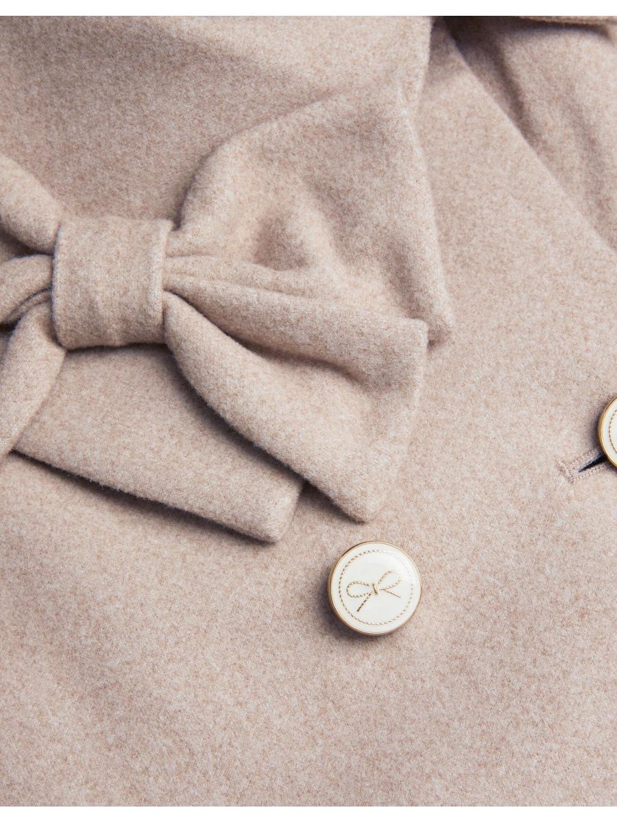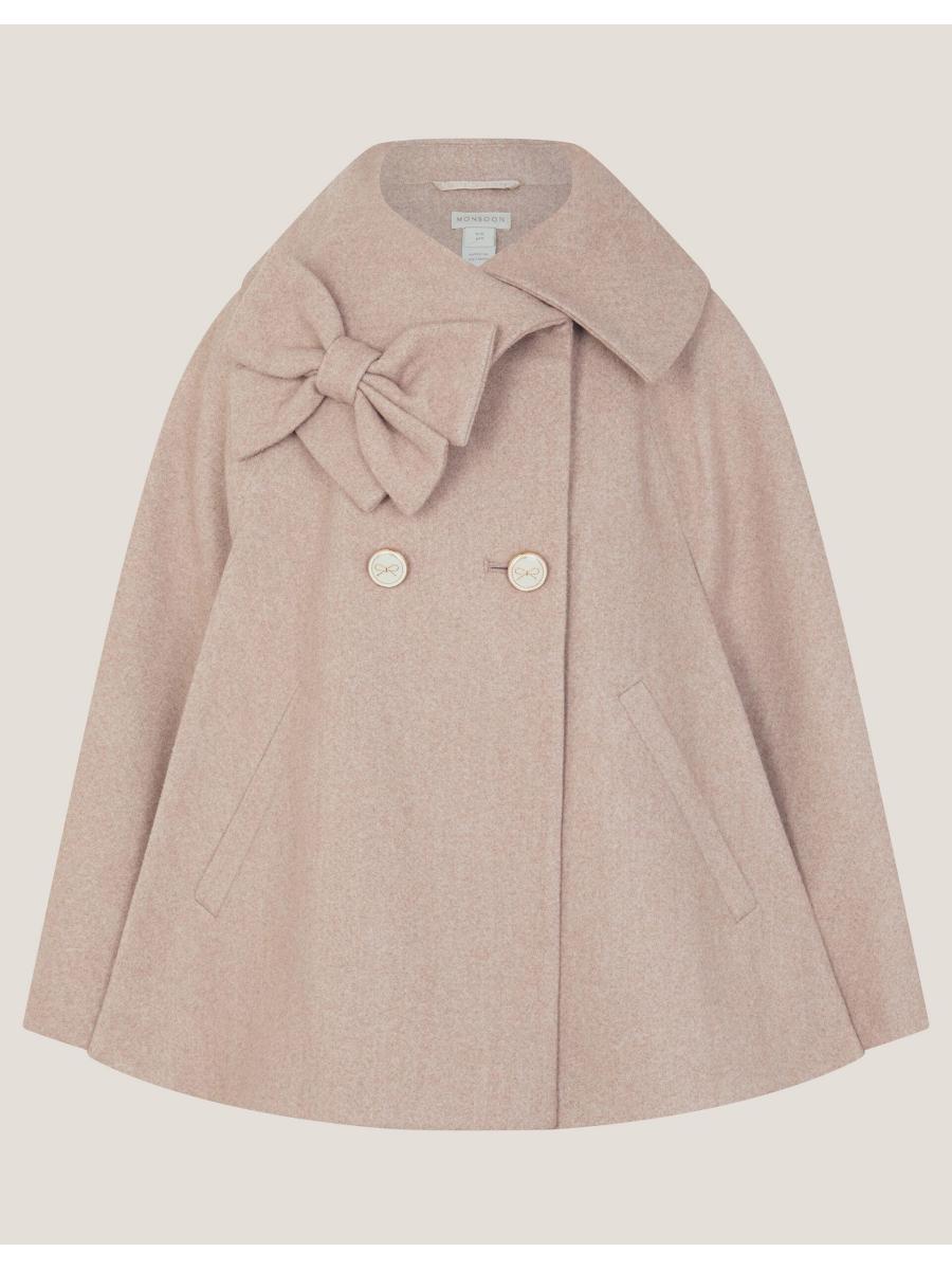Who needs sleeves anyway? The perfect layer to go over all their occasion outfits when temperatures cool, this coat is a bow-tiful addition to their outerwear. Designed in a cape silhouette, it features a collared neckline, double-breasted buttons and a statement bow detail for a playful finish. Camel