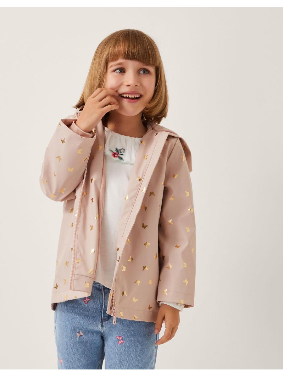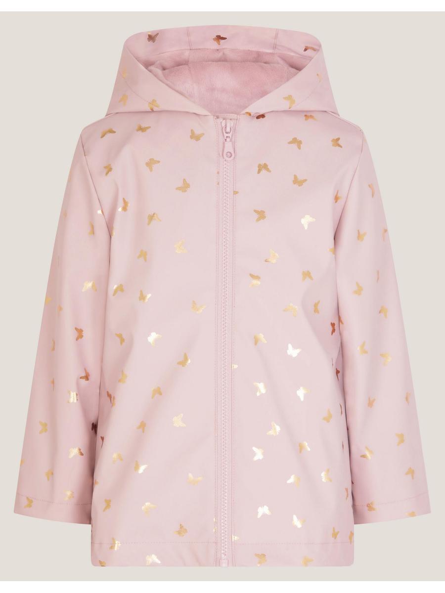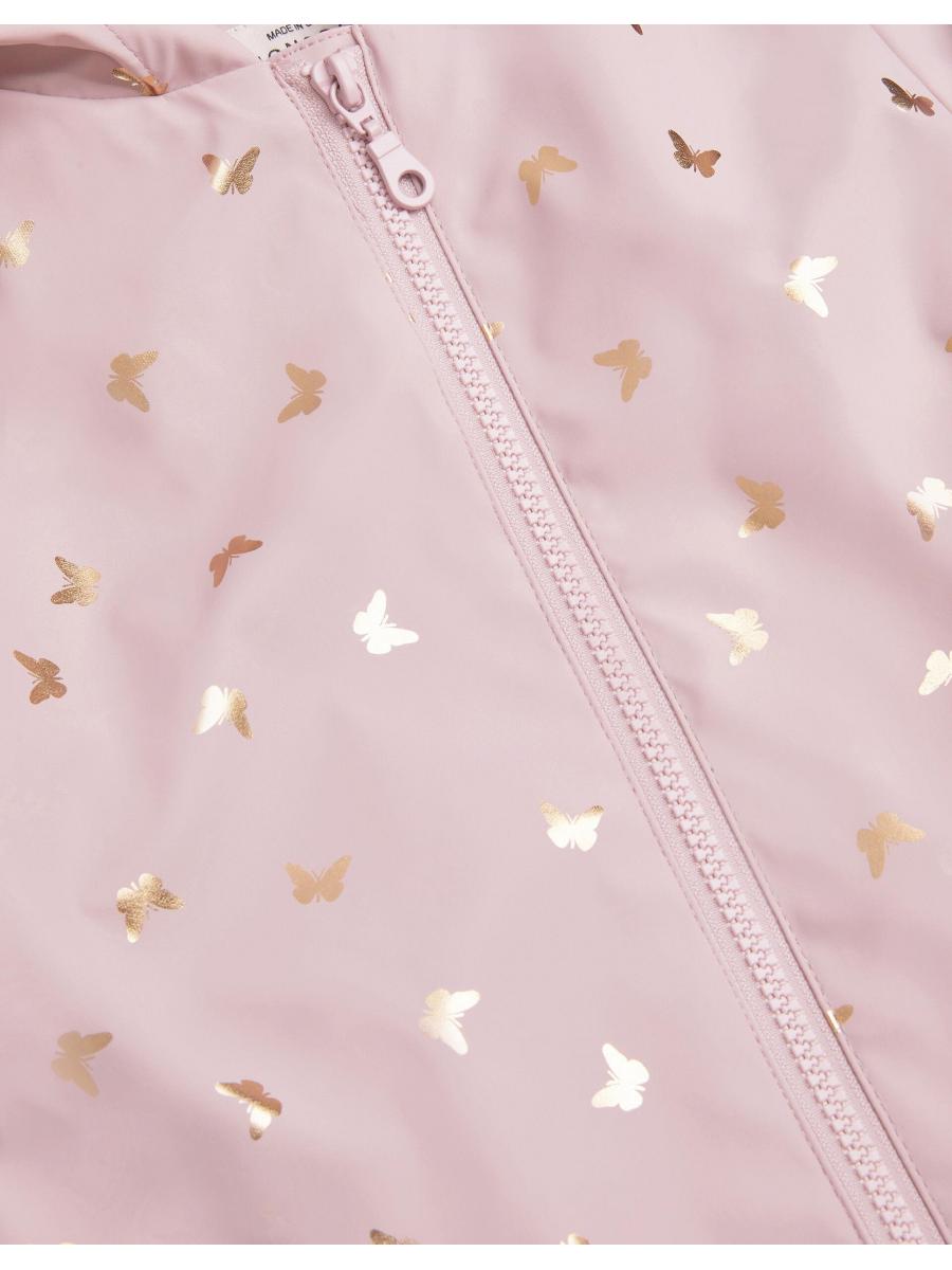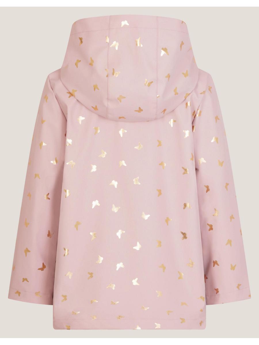Dazzle for drizzly days. Perfect for all their outdoor adventures, this rain coat features a hood, zip fastening and golden butterfly motifs fluttering all-over the water-resistant fabric. Pink