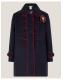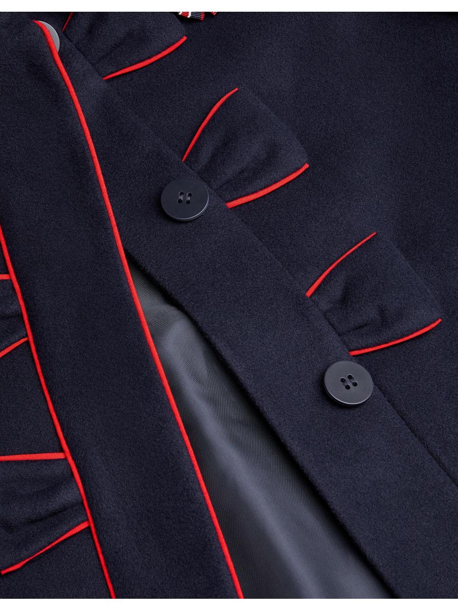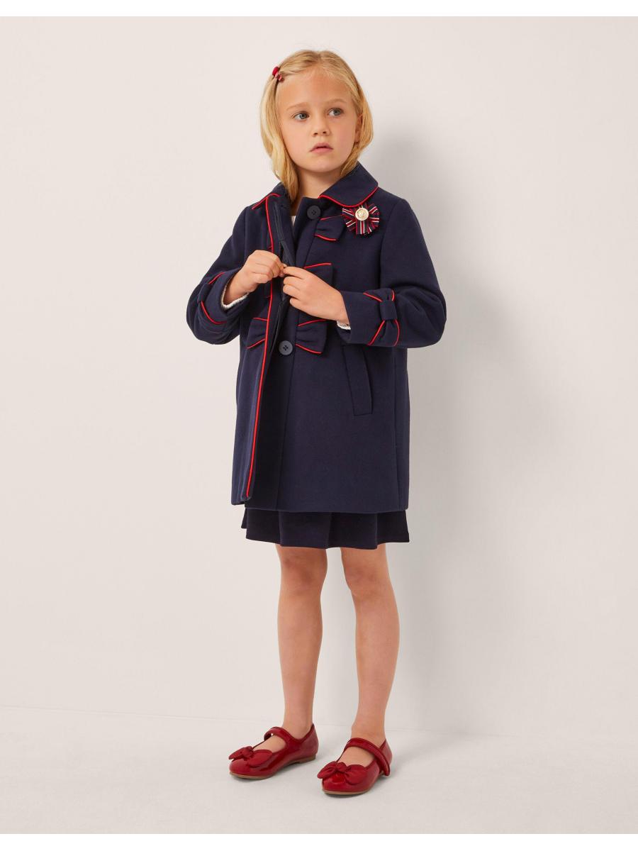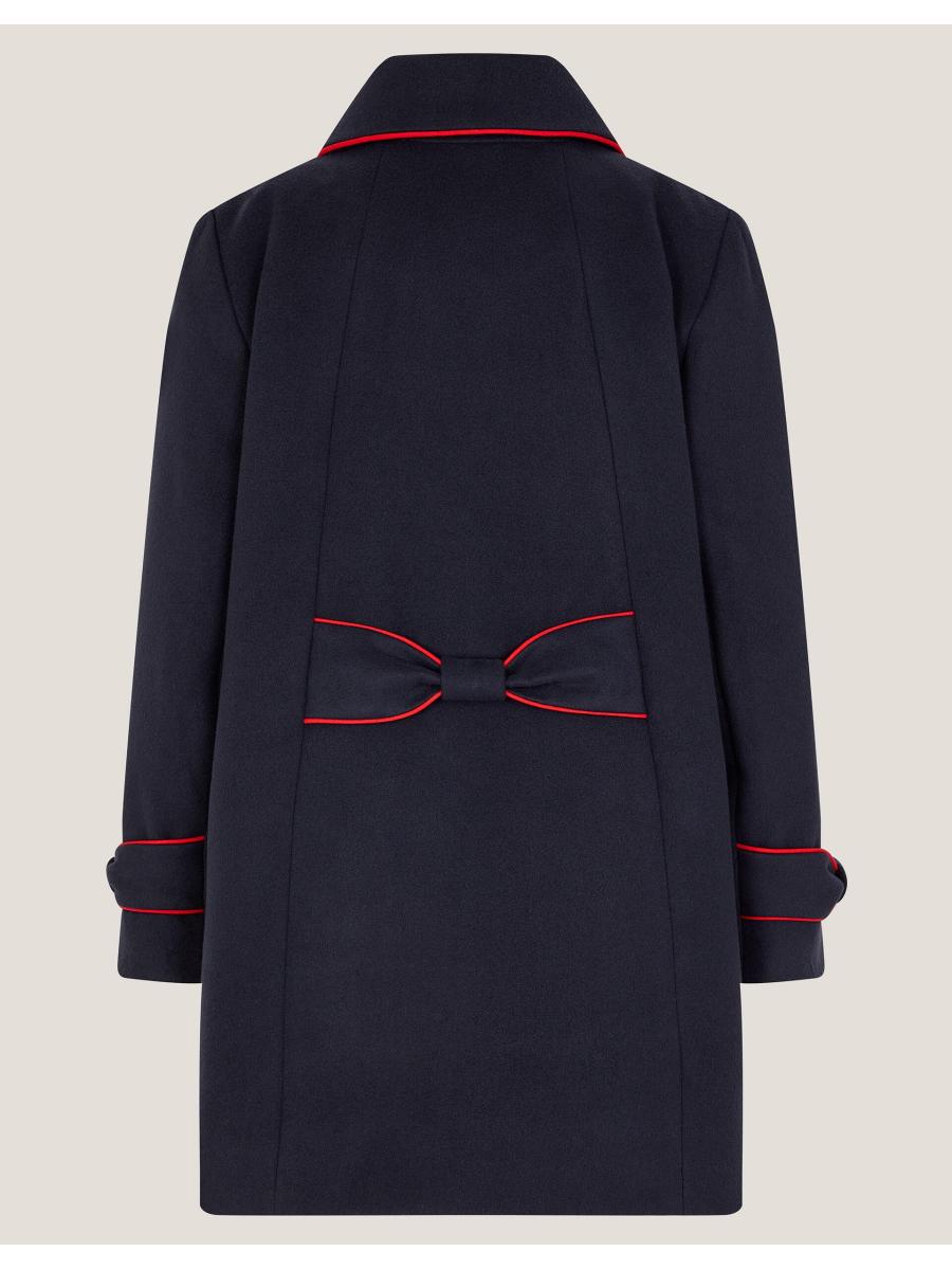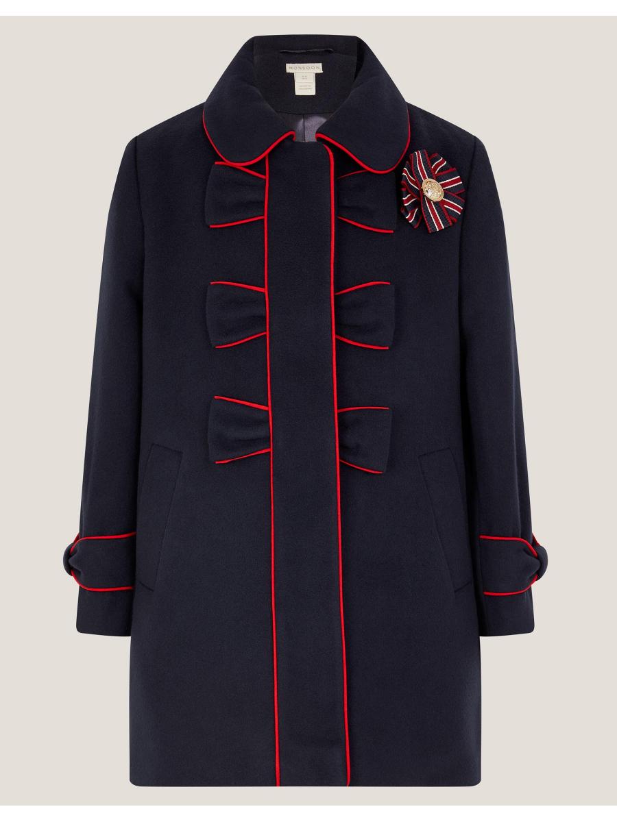 Because style starts young. Featuring striking red piping and pretty bow details, this coat is a stylish addition to their wardrobe. Finished with a classic collar, front button fastenings, and a striped rosette brooch. Blue