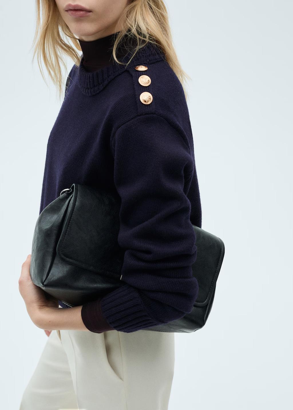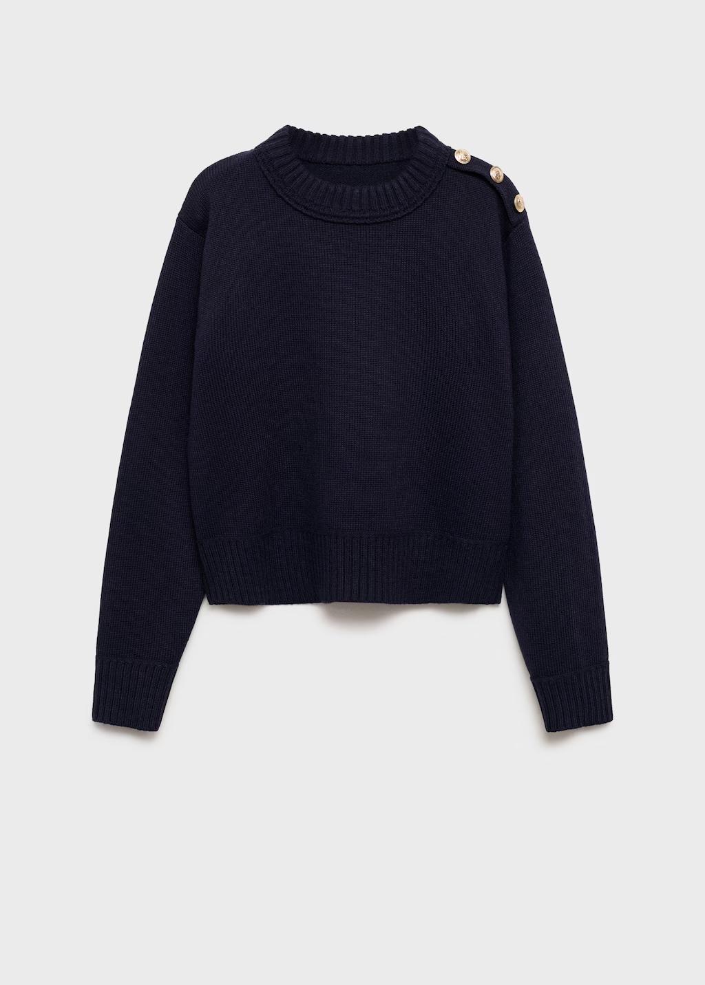 Tejido mezcla de lana. Tejido de punto grueso. Diseño recto. Cuello redondo. Manga larga. Terminaciones en canalé. Detalle de botones en el hombro. Botones efecto joya. Sin cierre. Disponible Plus
