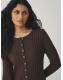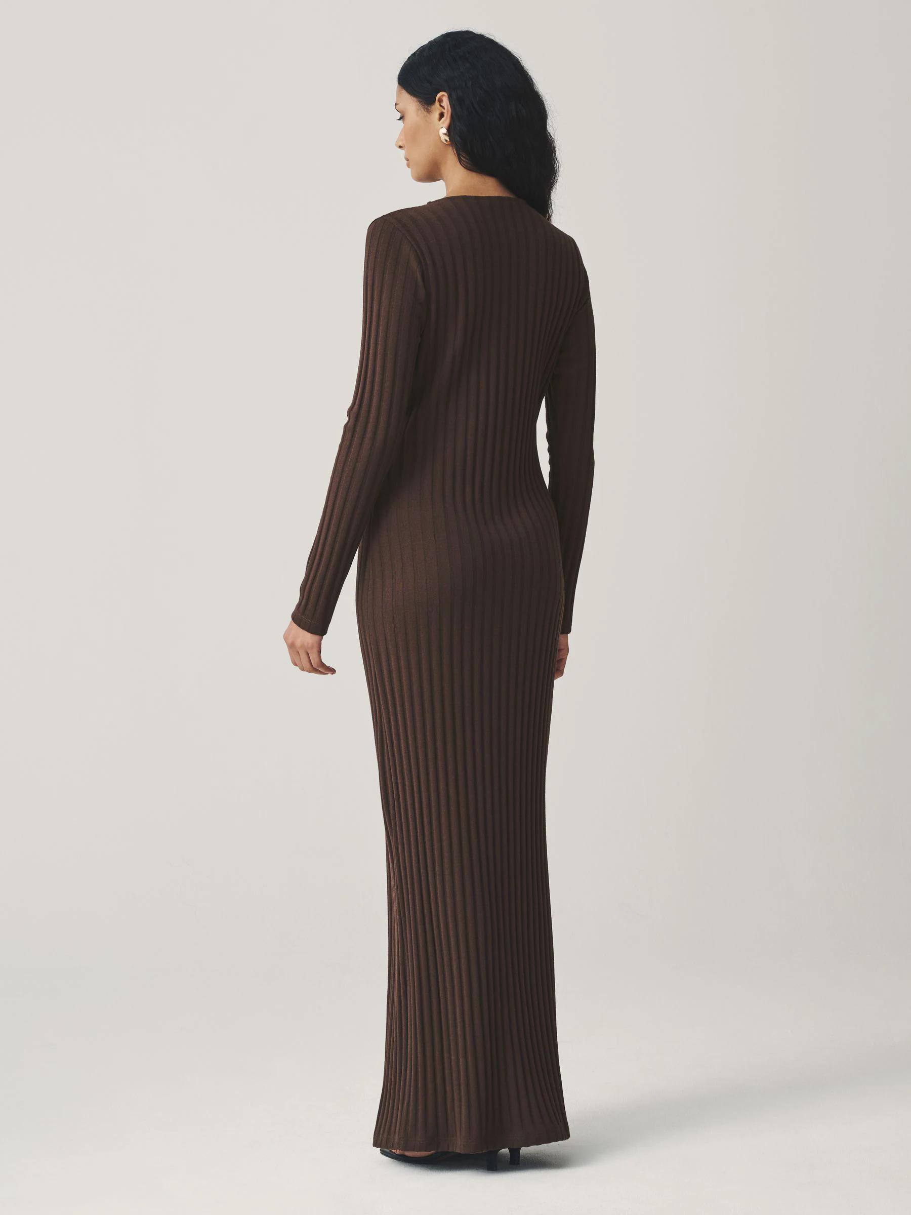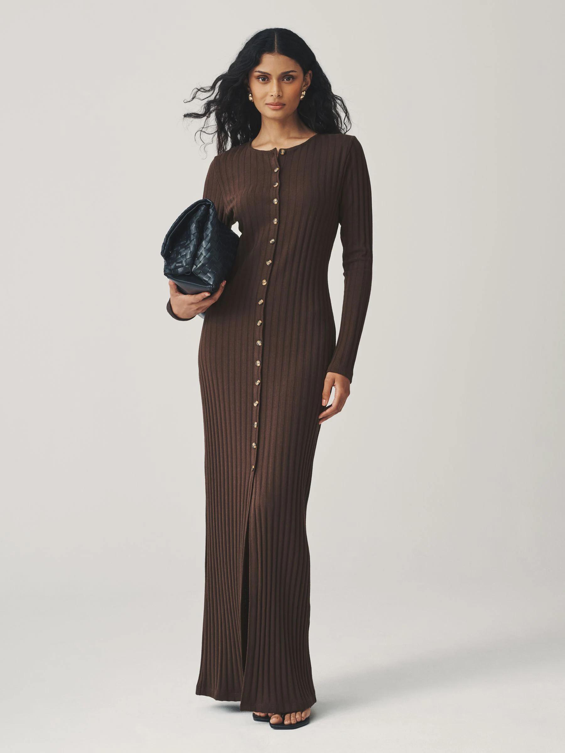 Chocolate Brown Ribbed Long Sleeve Button Down Midi Dress