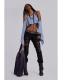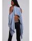 Grey-blue slinky jersey cape top with black PU leather binding and cut-out shoulder detail.