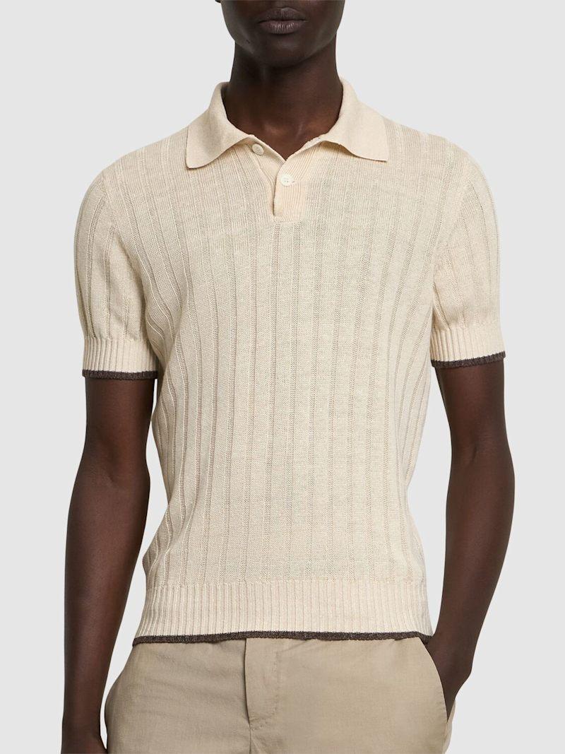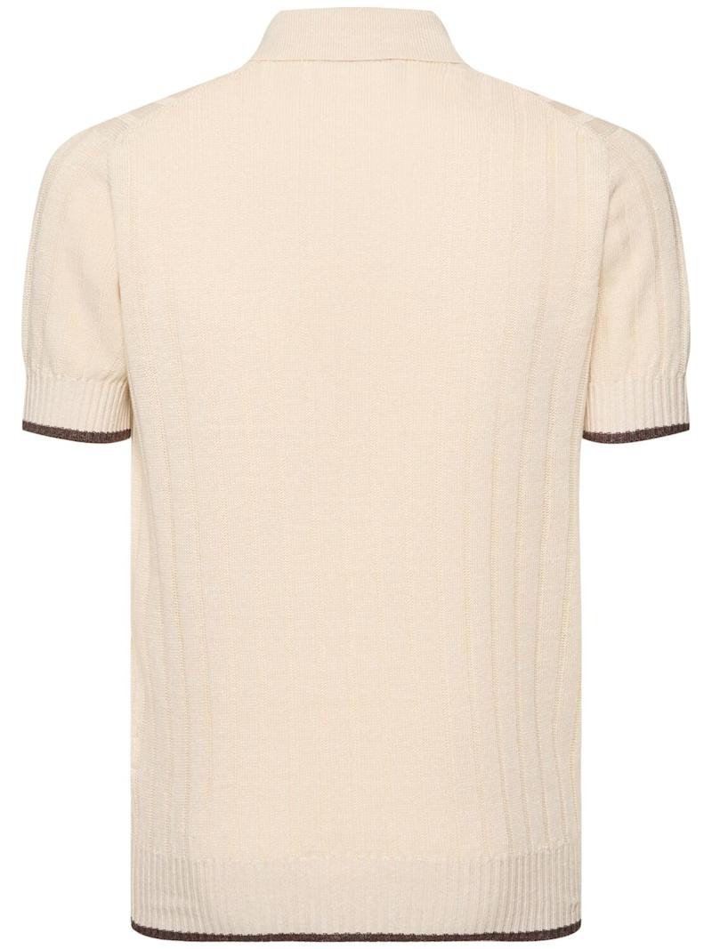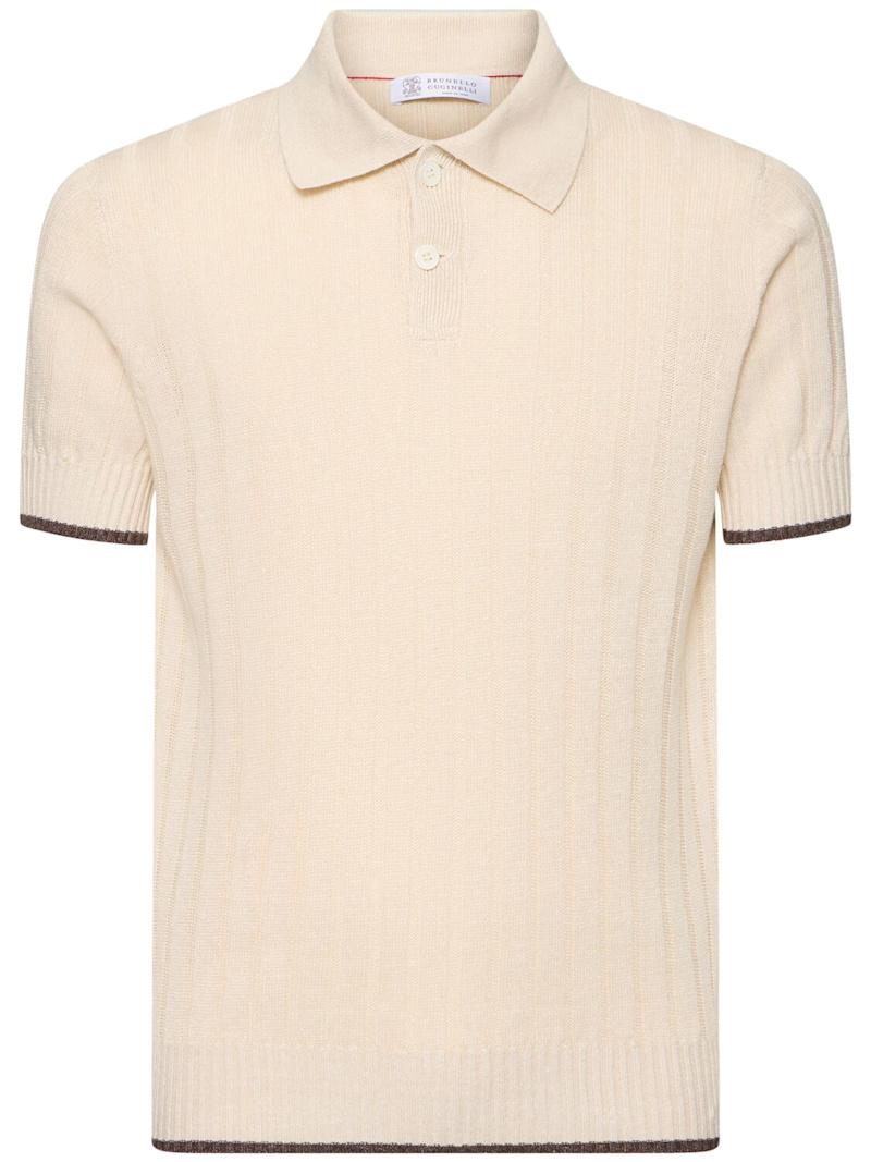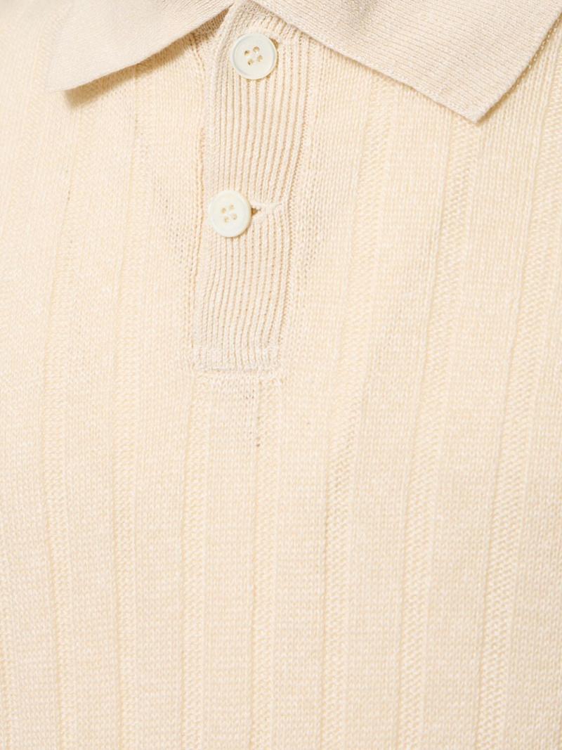 棉&亚麻POLO衫 - 米黄色/白色 - 男士 - Brunello Cucinelli - 正面半开襟纽扣.