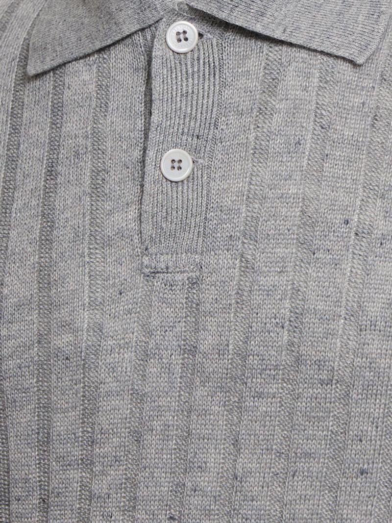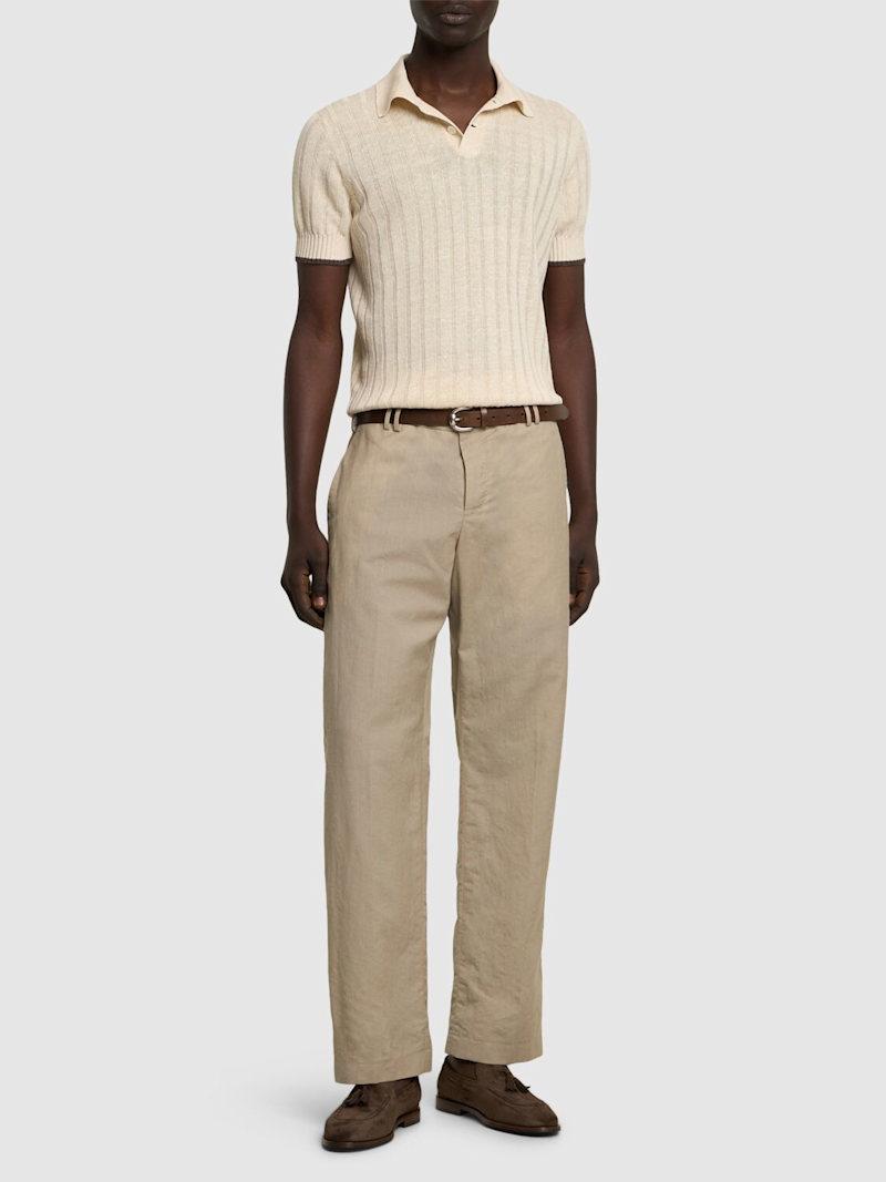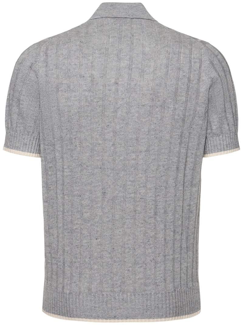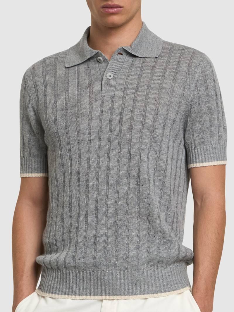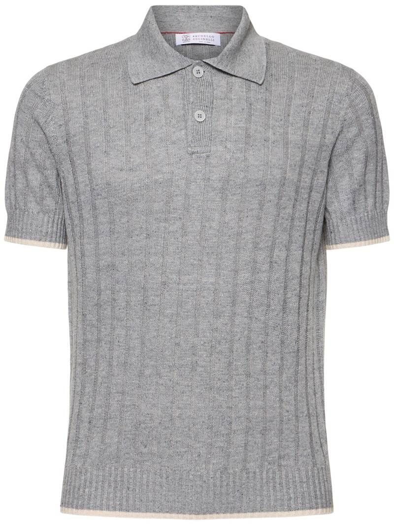 棉&亚麻POLO衫 - 米黄色/白色 - 男士 - Brunello Cucinelli - 正面半开襟纽扣.