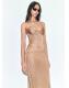 Tejido de lúrex. Diseño lápiz. Diseño midi. Detalles calados. Tiro bajo. Cintura con goma elástica. Sin cierre. Total look. La modelo mide 1,80 y lleva una talla S/36. Colaboración SUPRIYA LELE X MANGO. En colaboración con la reconocida diseñadora indio-británica, Supriya Lele x Mango se inspira en un paisaje onírico y evocador, donde fantasía y realidad se entremezclan. Con siluetas sensuales y fluidas, la colección evoca la calidez y la ligereza de las noches de verano en la ciudad