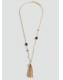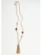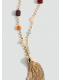 Diseño metálico. Abalorios combinados. Detalle de flecos metálicos. Cierre de cadena y mosquetón
