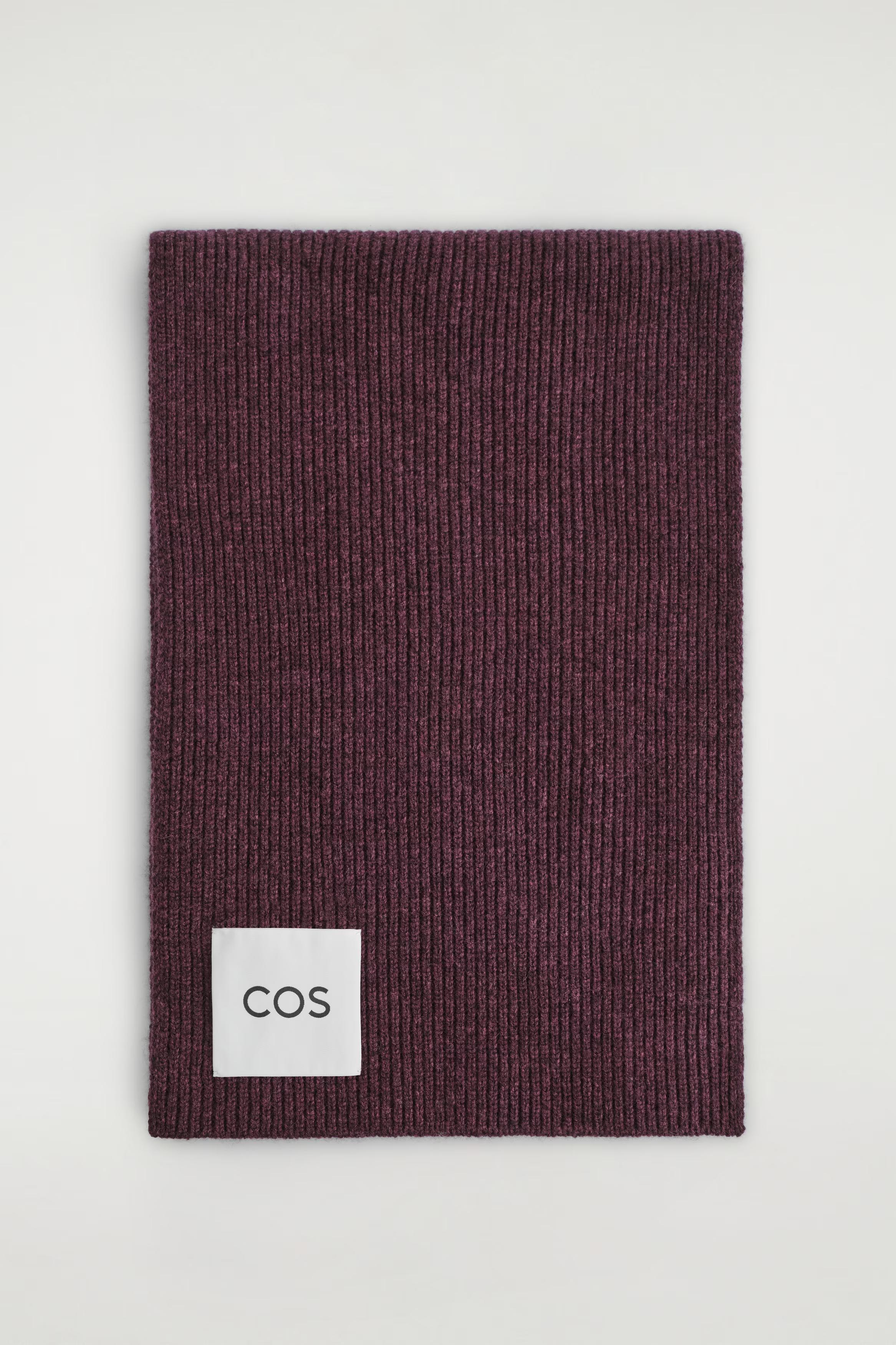 This chunky scarf can be effortlessly draped around your shoulders when the weather cools. Supremely soft to the touch, it's knitted from a premium blend of wool and cashmere that's ribbed for tactility and finished with the signature COS motif. The classic navy tone lends itself to a winter palette.\u0026nbsp;This product contains Responsible Wool Standard TE-00047206 (RWS) wool fibre from farms certified to animal welfare and land-management requirements\u0026nbsp;Shell: 70% RWS Wool, 30% Recycled cashmere. Excluding trims / Hand wash\u0026nbsp;Length: 170cm, Width: 26cm