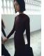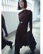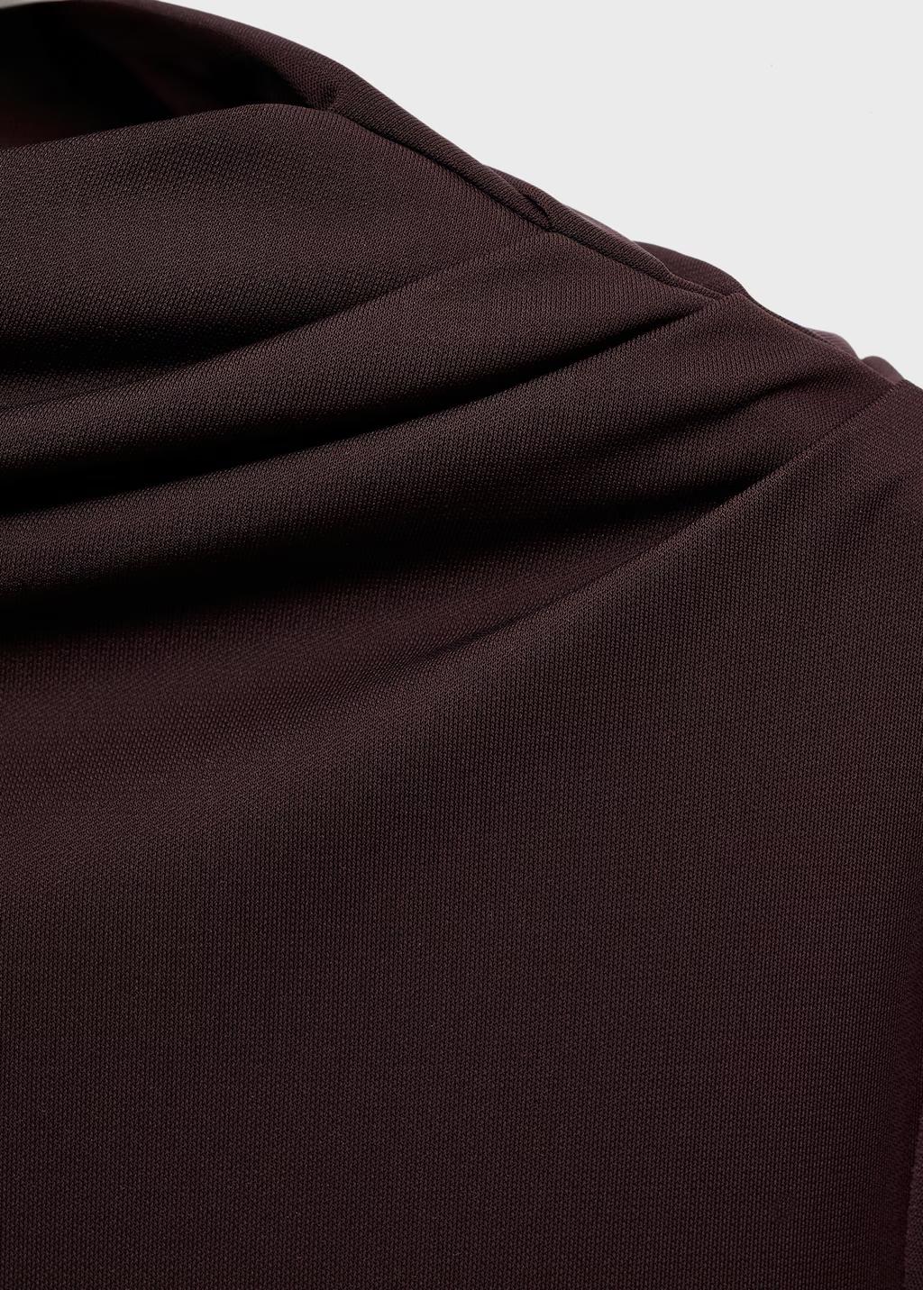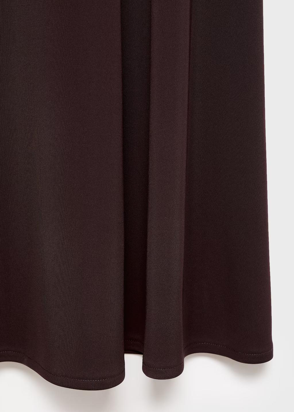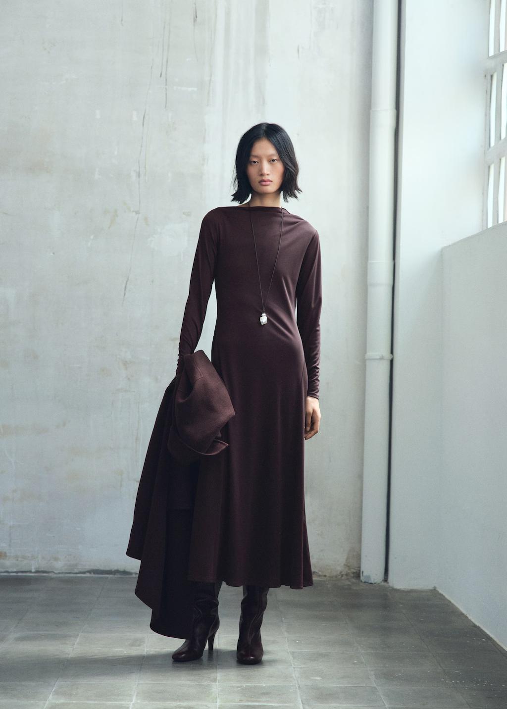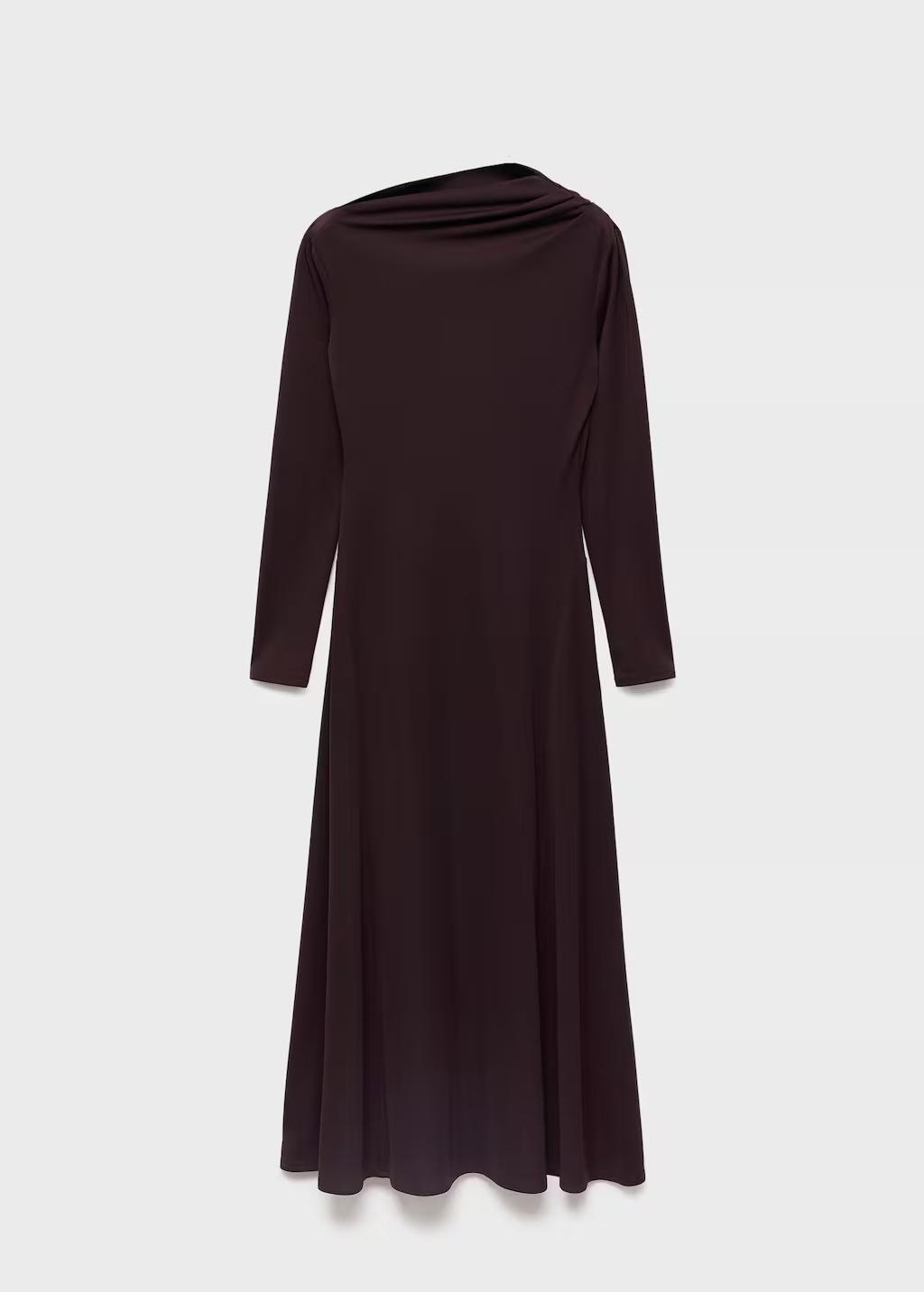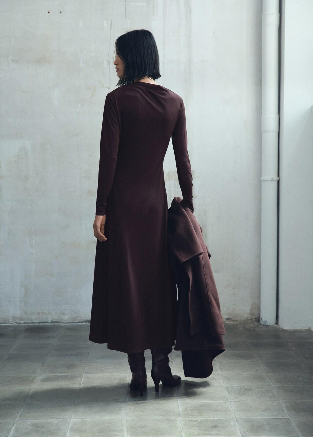 Tejido elástico. Diseño midi. Diseño evasé. Cuello asimétrico. Manga larga. Sin cierre