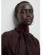 Con un diseño recto, esta prenda presenta un elegante cuello alto adornado con fular y mangas largas con puños abotonados