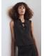 Con un diseño entallado, esta prenda presenta un cuello pico adornado con detalle de lazos. Con tirantes anchos, se completa con un cierre de cremallera en la parte posterior. Cuenta con un pantalón a conjunto