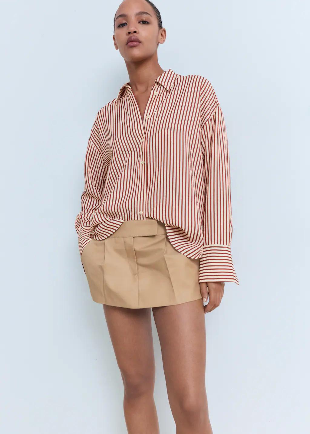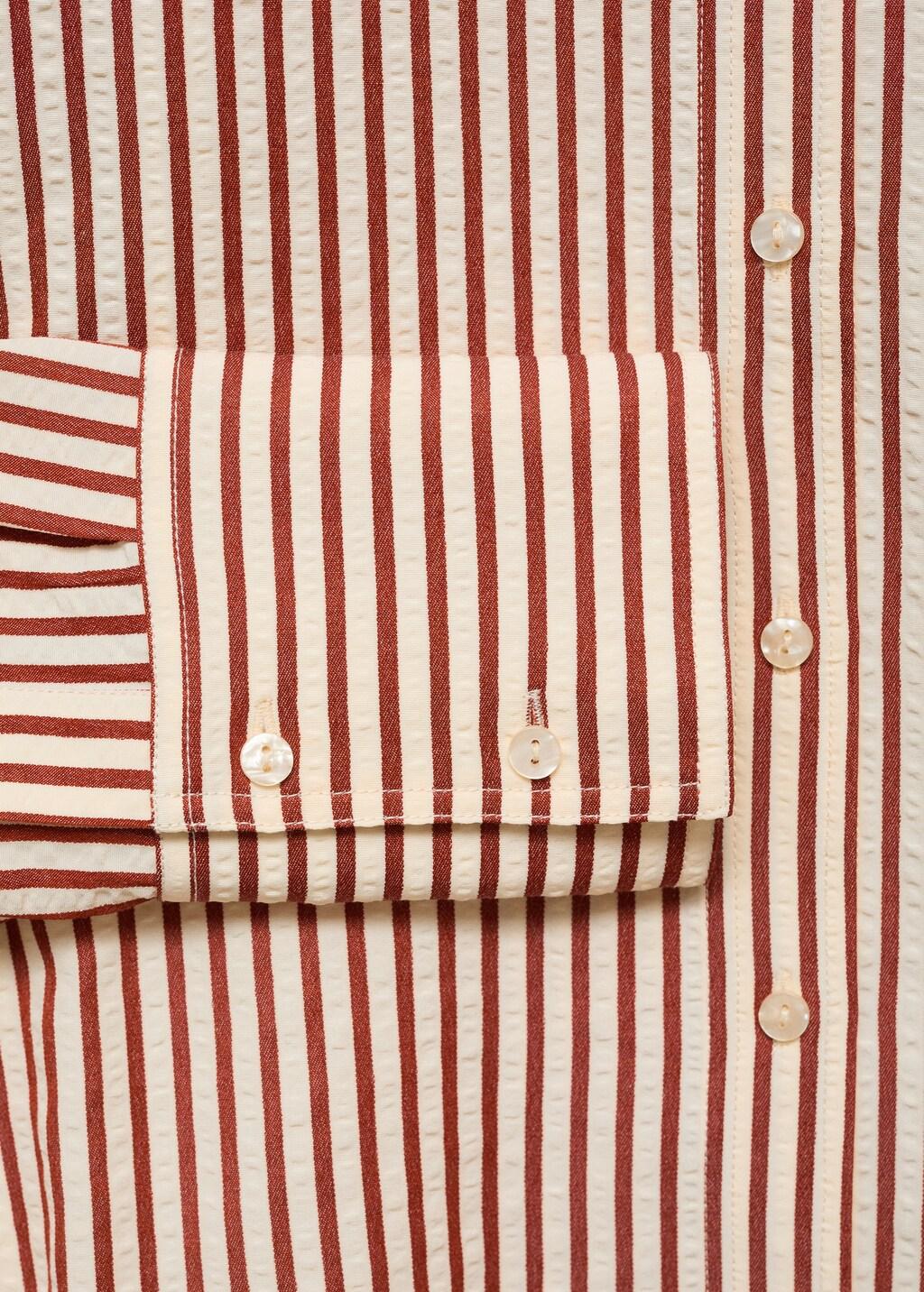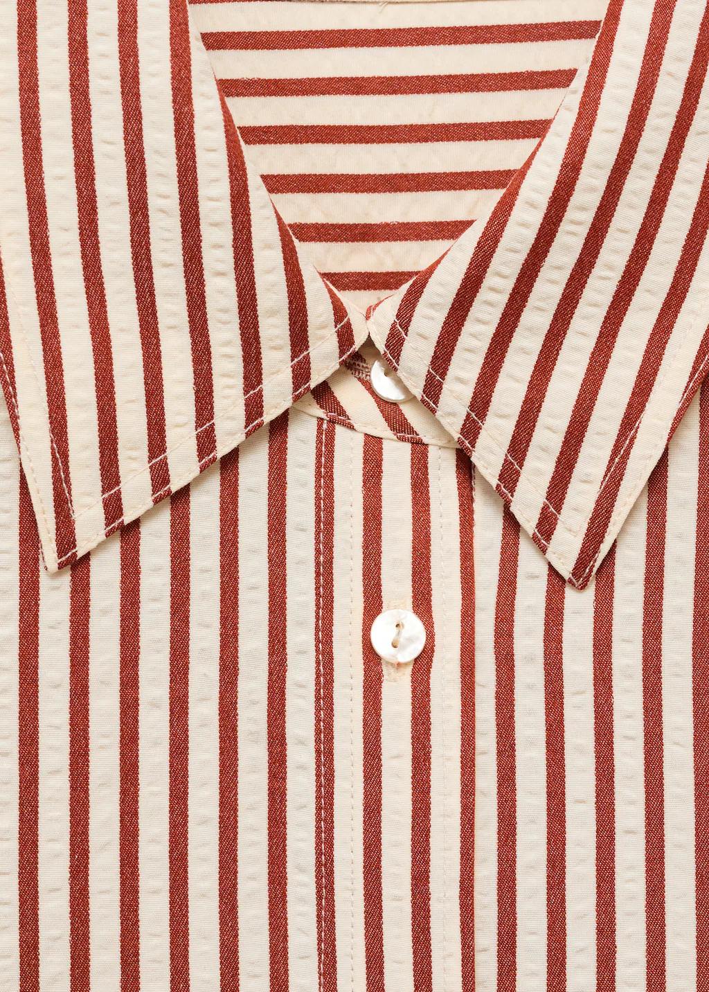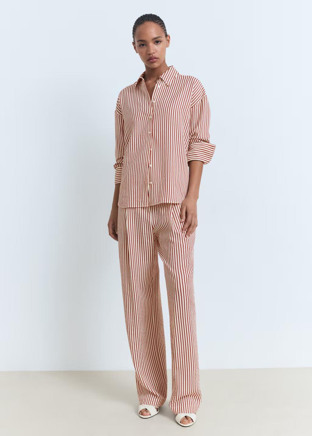 Con diseño recto y de rayas, esta prenda presenta un cuello camisero y manga larga. Cuenta con un pantalón a juego para un 'total look'
