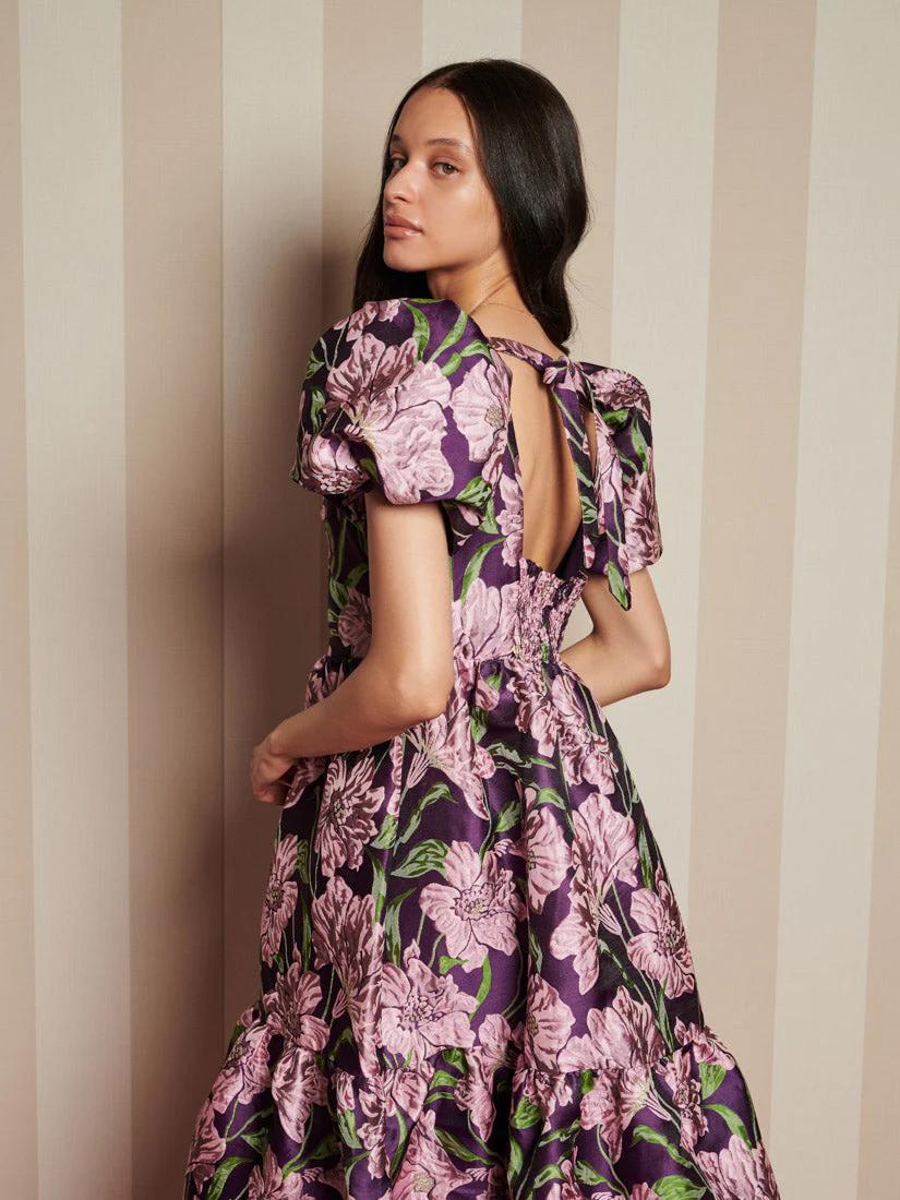 In full bloom for fall, the Floraison Jacquard Midi Dress brings florals alive with sleeves puffed in personality, a graceful silhouette that sways with ease, and woven details that catch the light just enough to feel both romantic and refined.