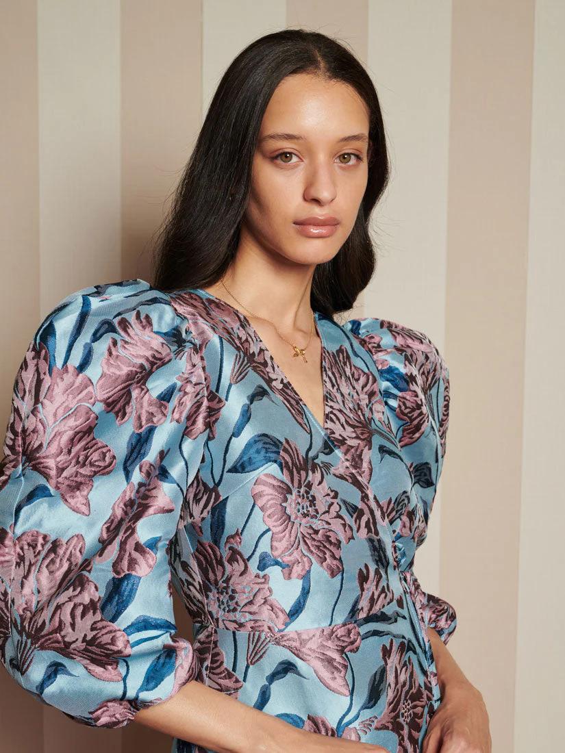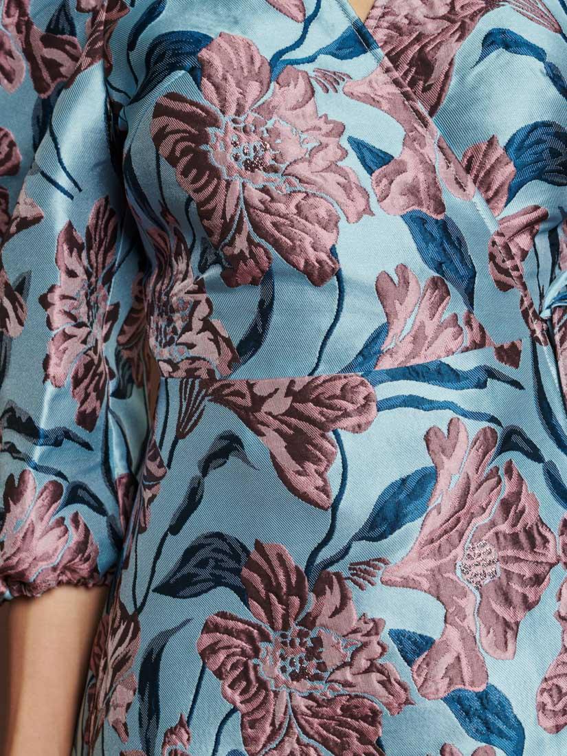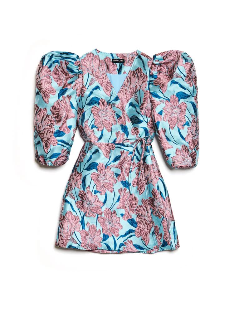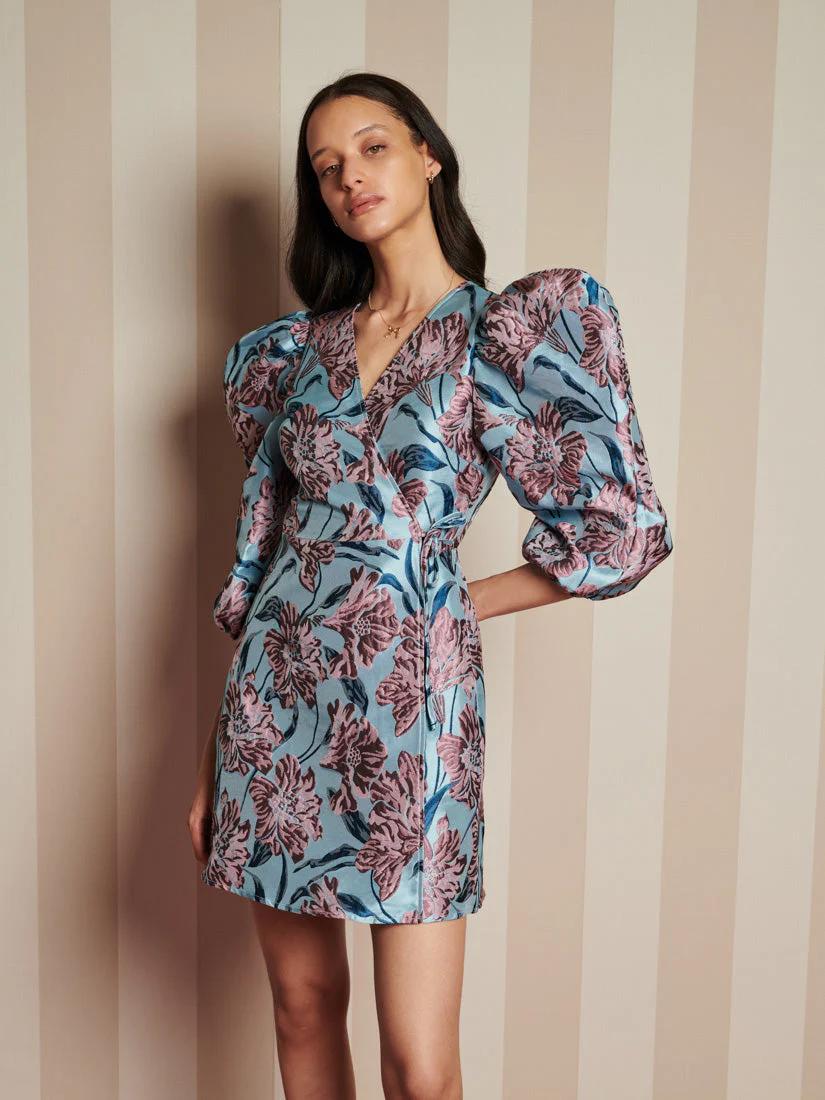 As if plucked from a larger-than-life bouquet in the hallway vase, the Deco Bloom jacquard Mini Wrap Dress blossoms with oversized florals and easy charm.