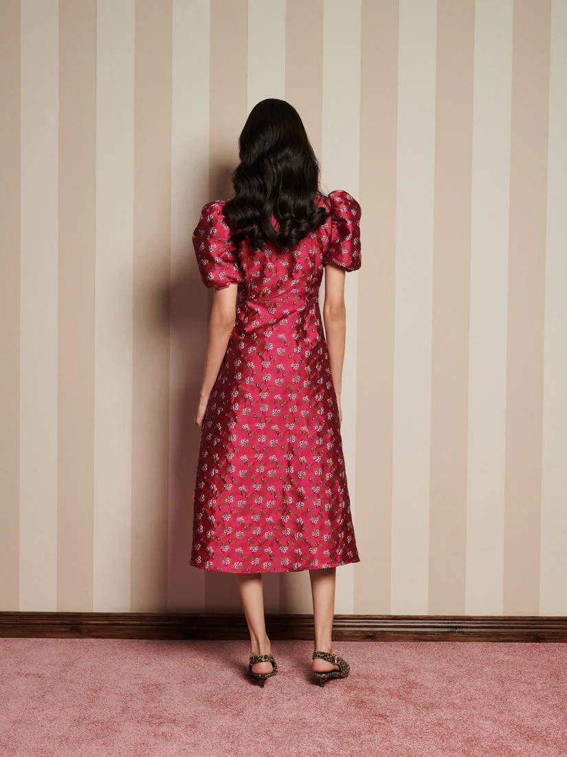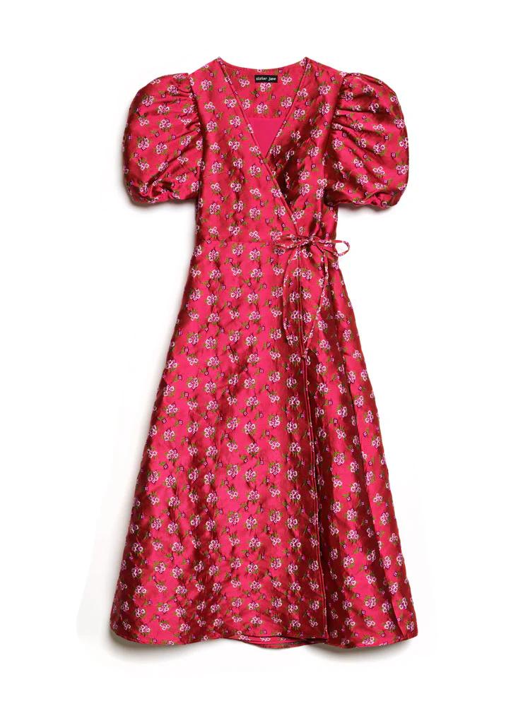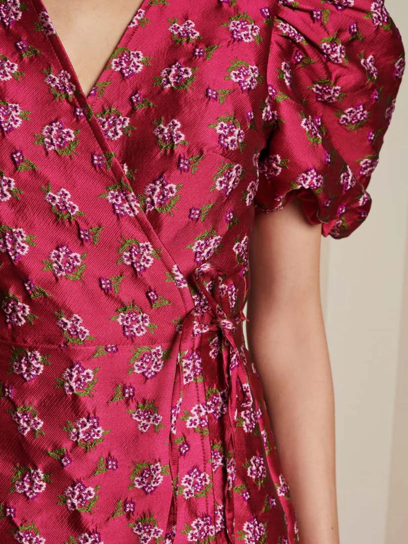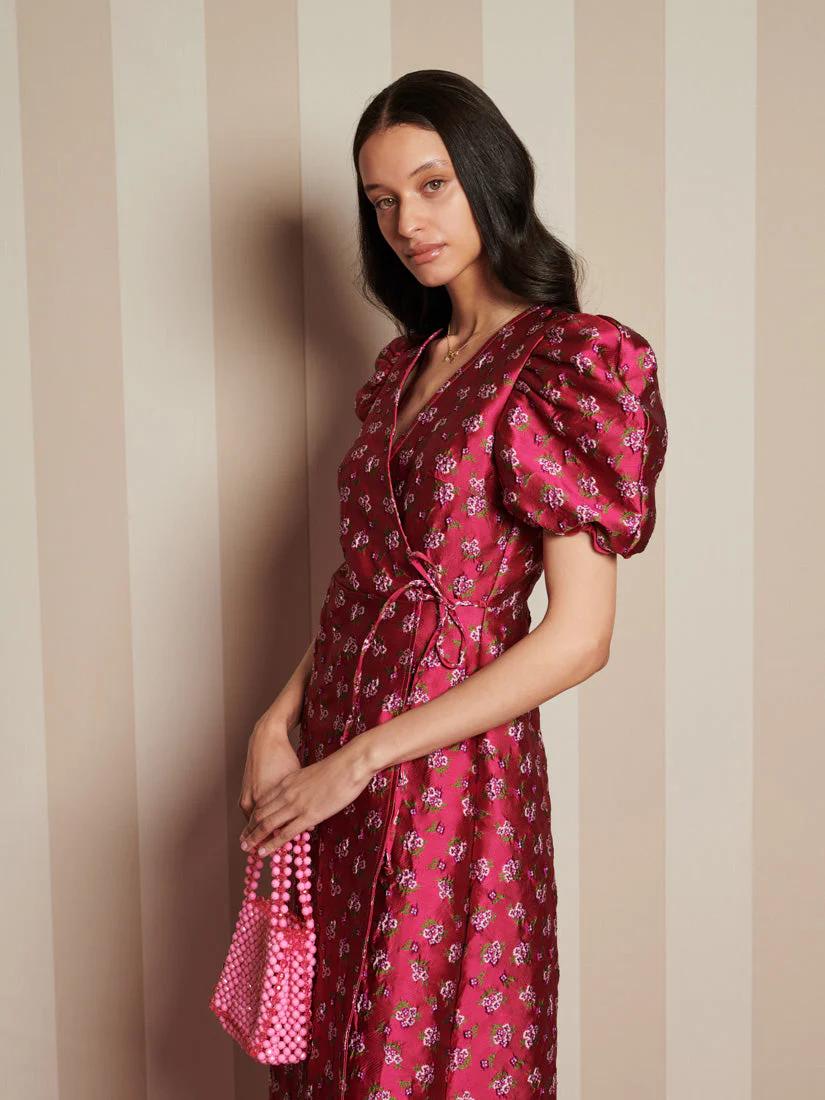 The Momento Jacquard Midi Wrap Dress feels like the wallpaper from your favorite corner-familiar, floral, and perfectly wrapped up in comfort.