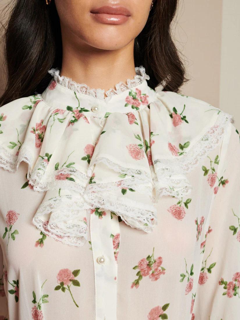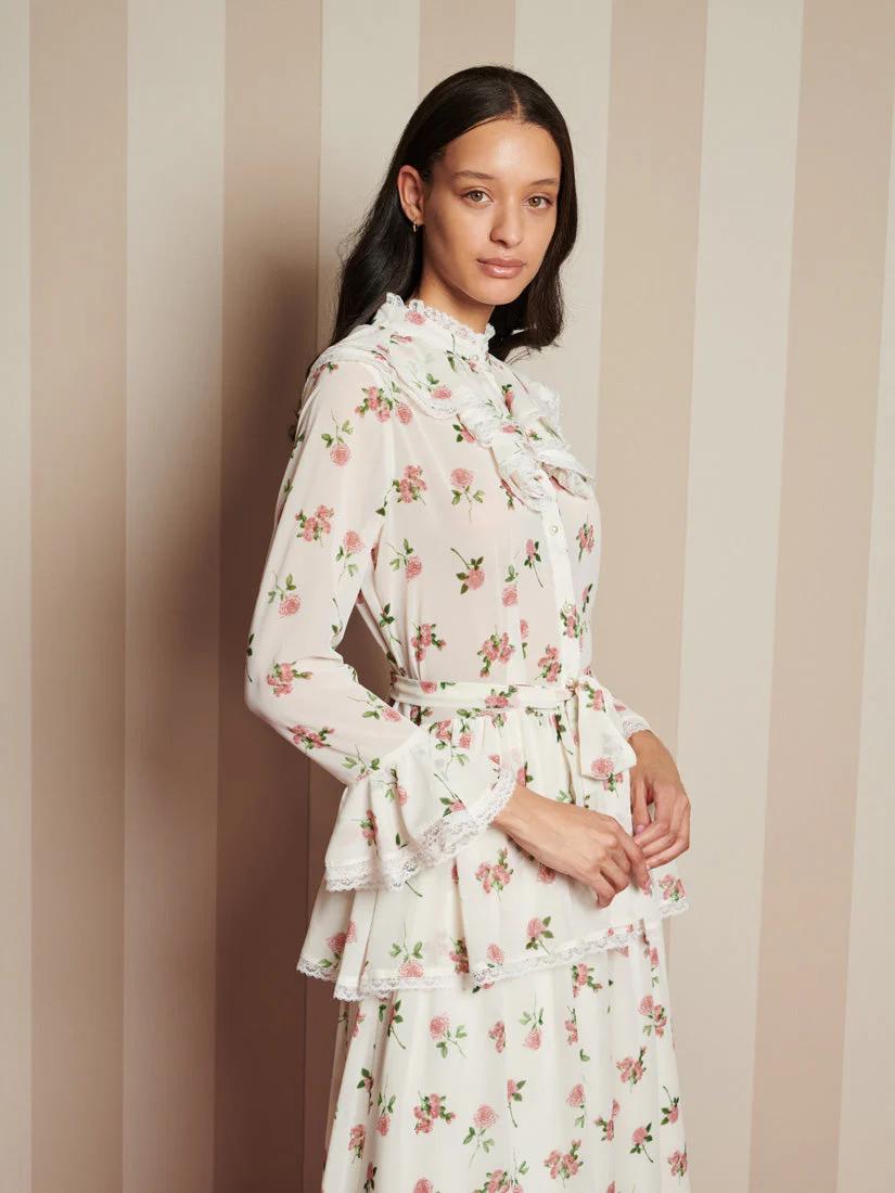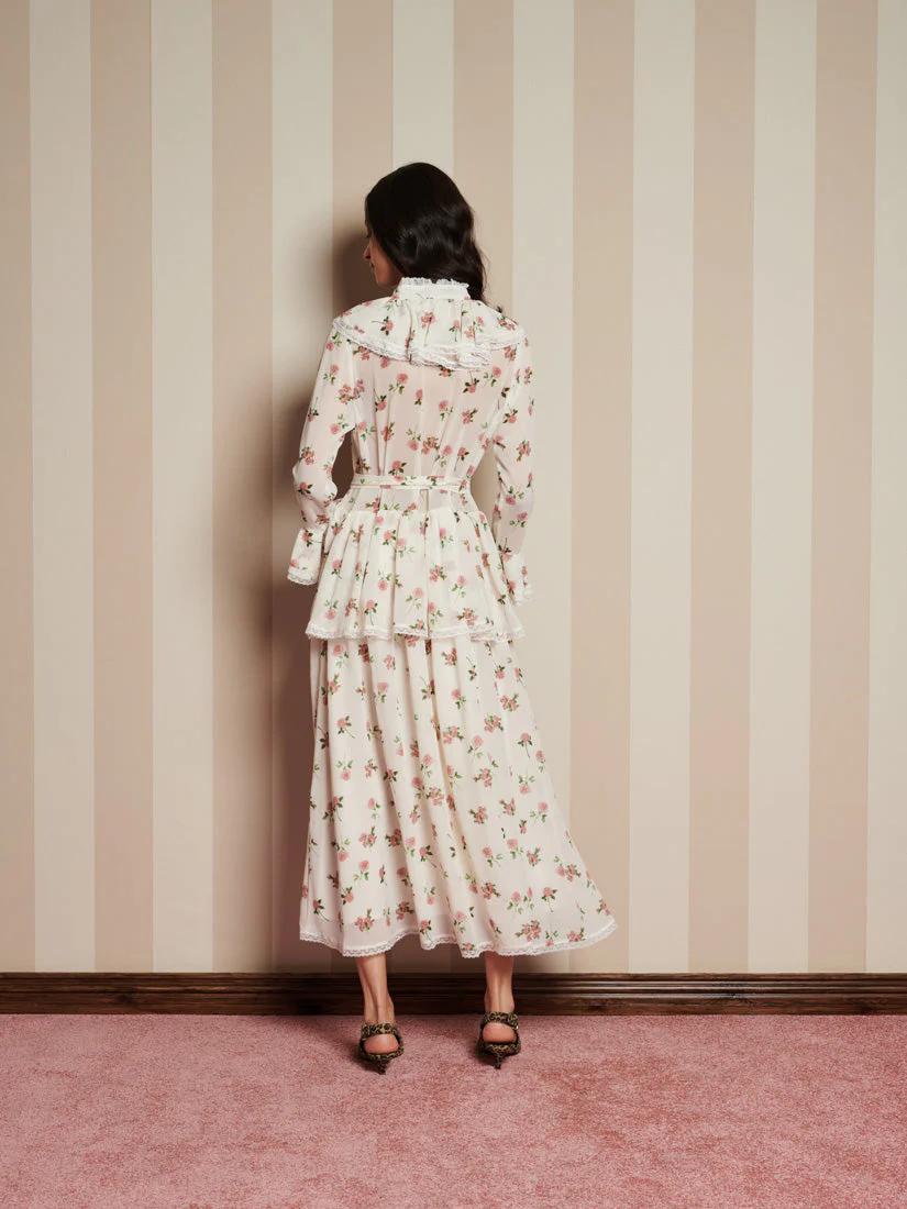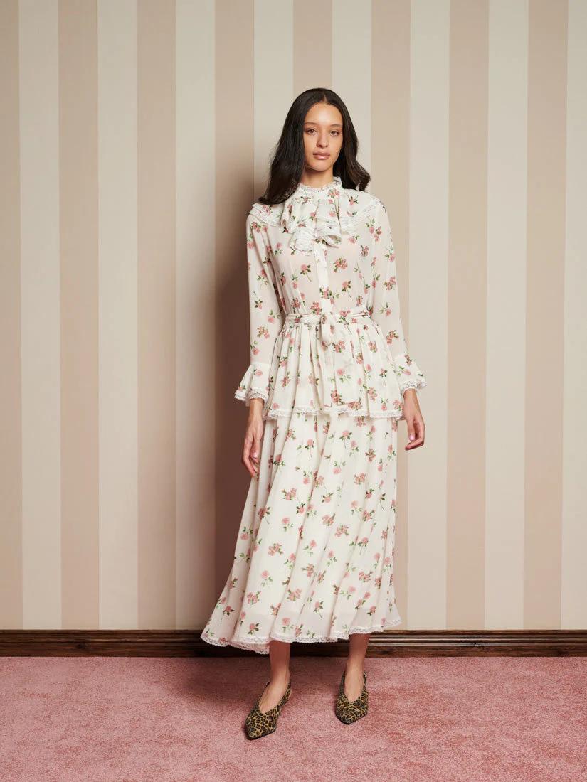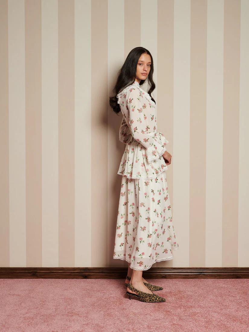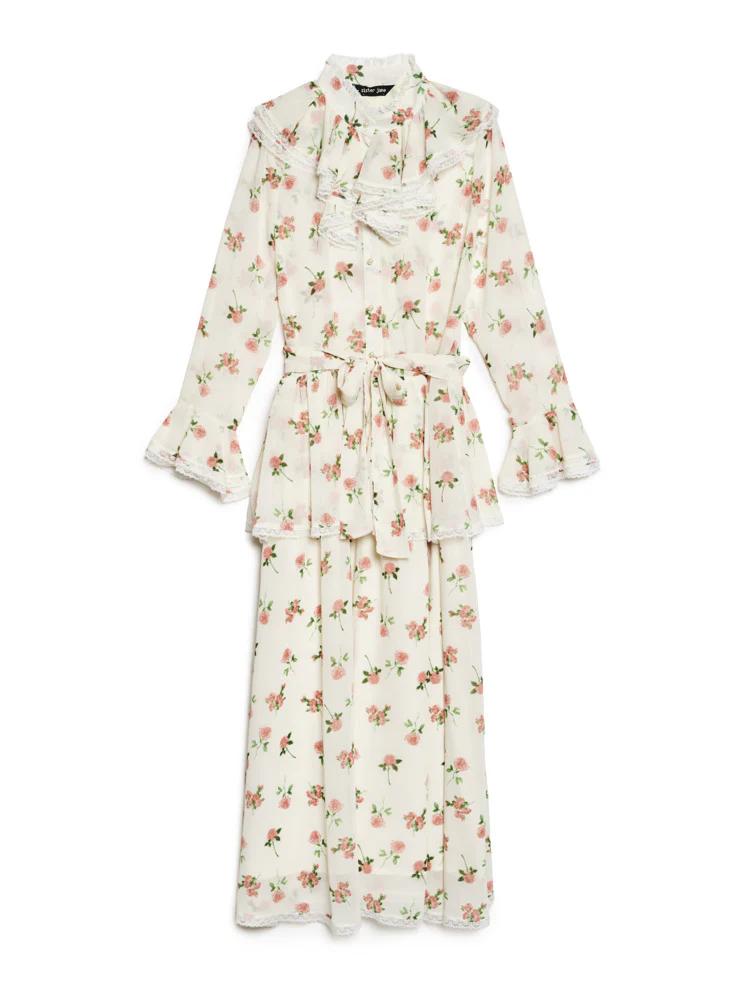 The Bay Flora Maxi Dress is floaty, belted, and trimmed in lace-like curtains caught in a gentle summer breeze.