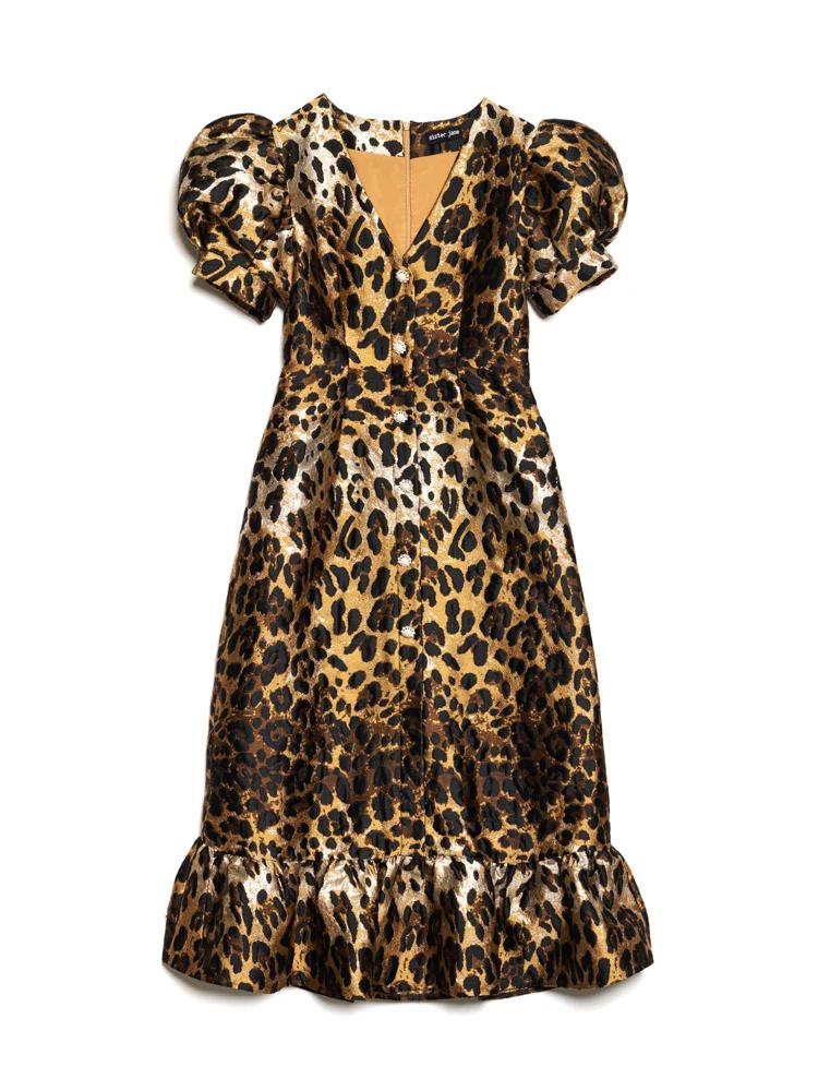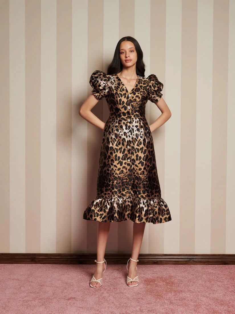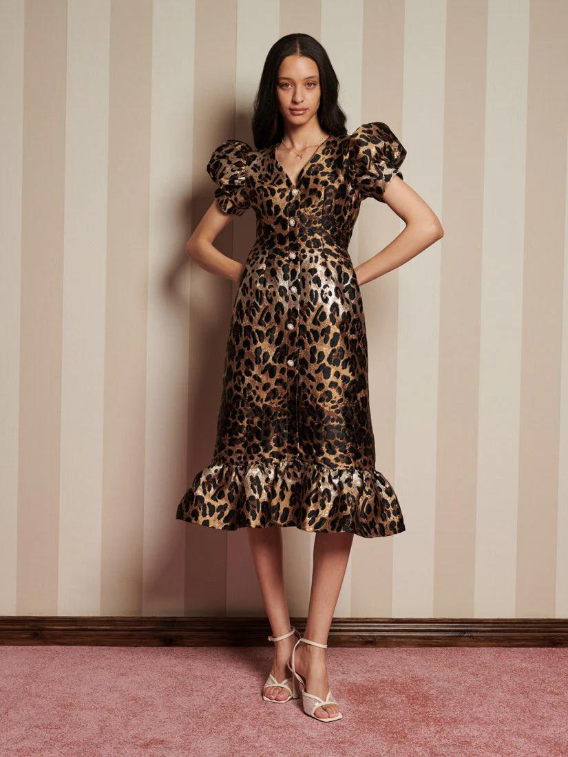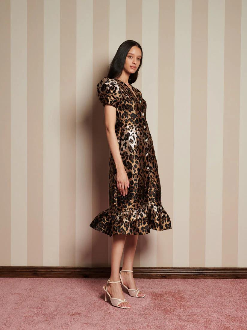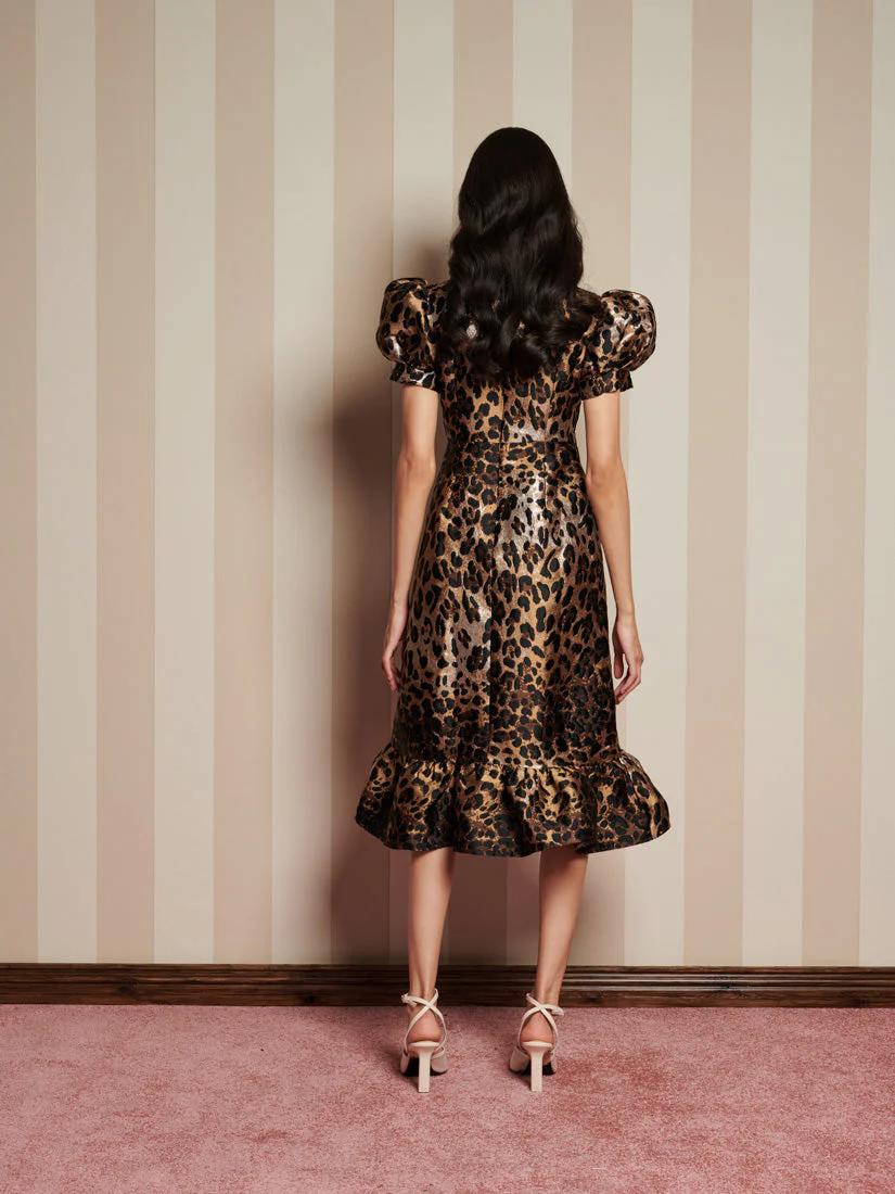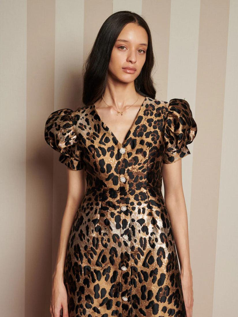 Pearl and gem buttons elevate the Suite Leopard Jacquard Midi Dress-eye-catching whether you’re entertaining at home or stepping out for the evening.