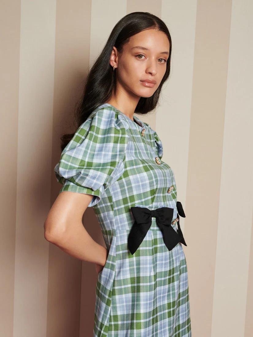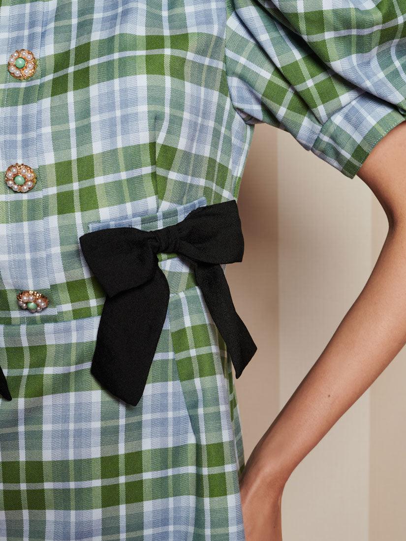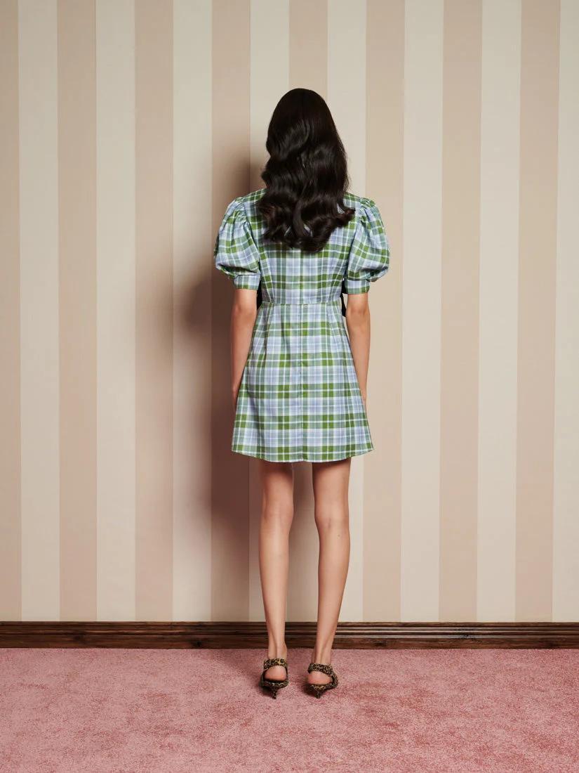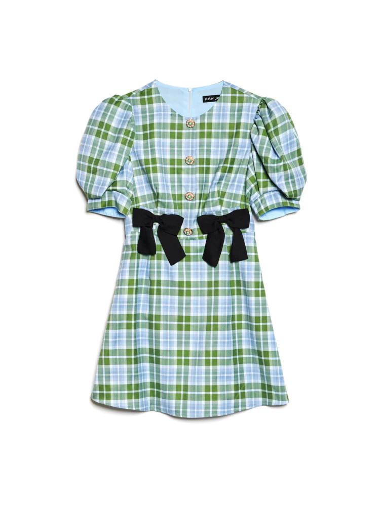 Buttons that glisten like cabinet handles and bows like tied parcels, The Foyer Check Mini Dress is pure keepsake charm.