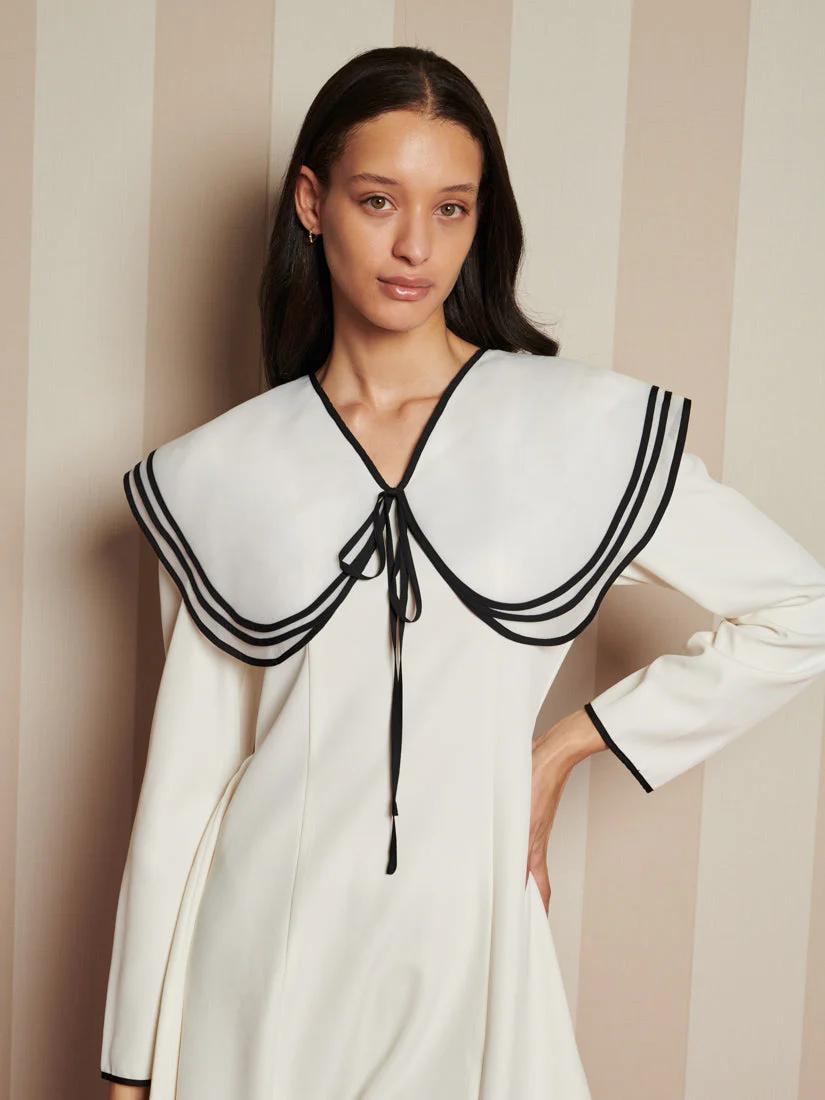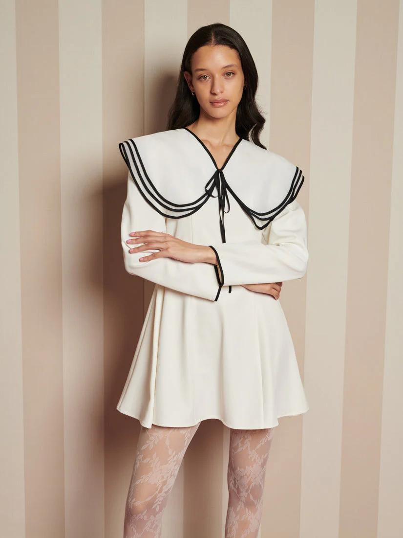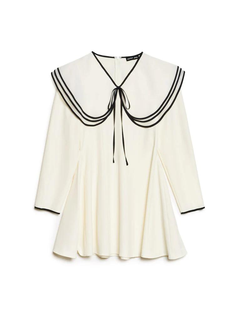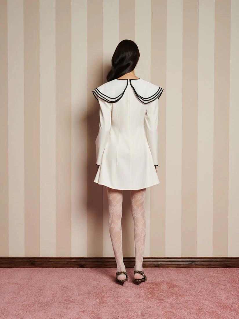 A playful nod to dress-up days, The Porcelain Collar Mini Dress features layers of collars like curtains tied back for the grand reveal.