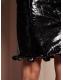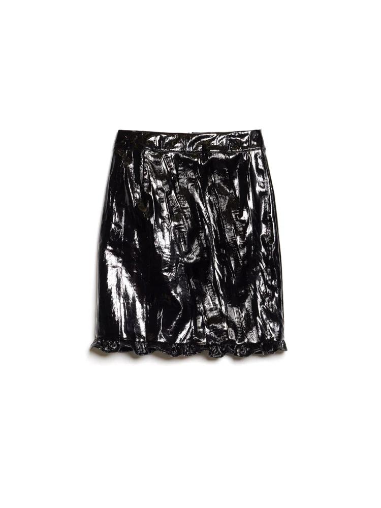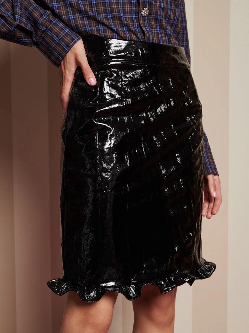 The Lunette PU Midi Skirt is slick and whimsical, with a ruffled hem that recalls the playful trim of a lampshade.