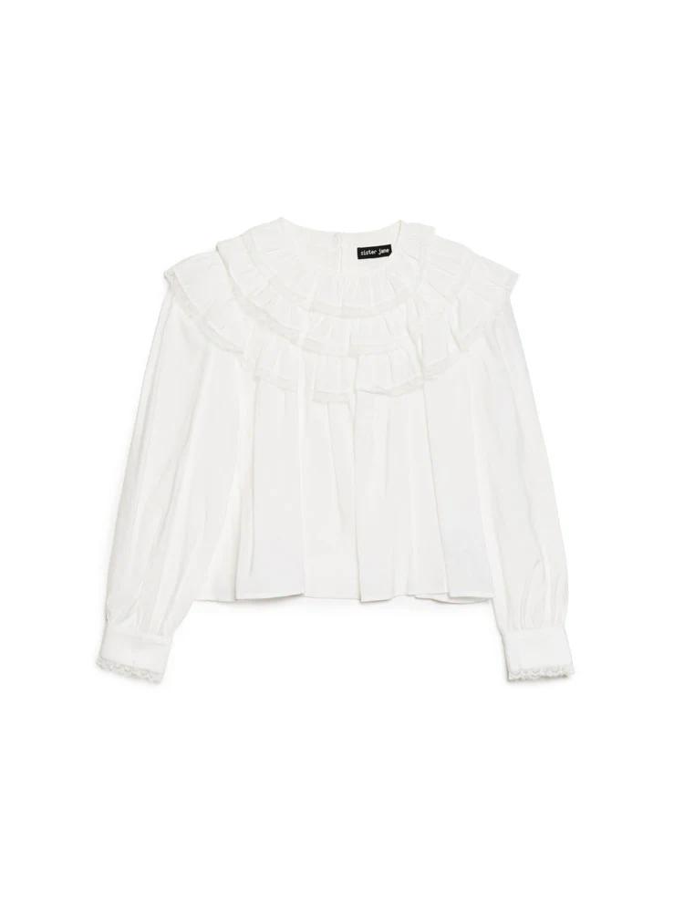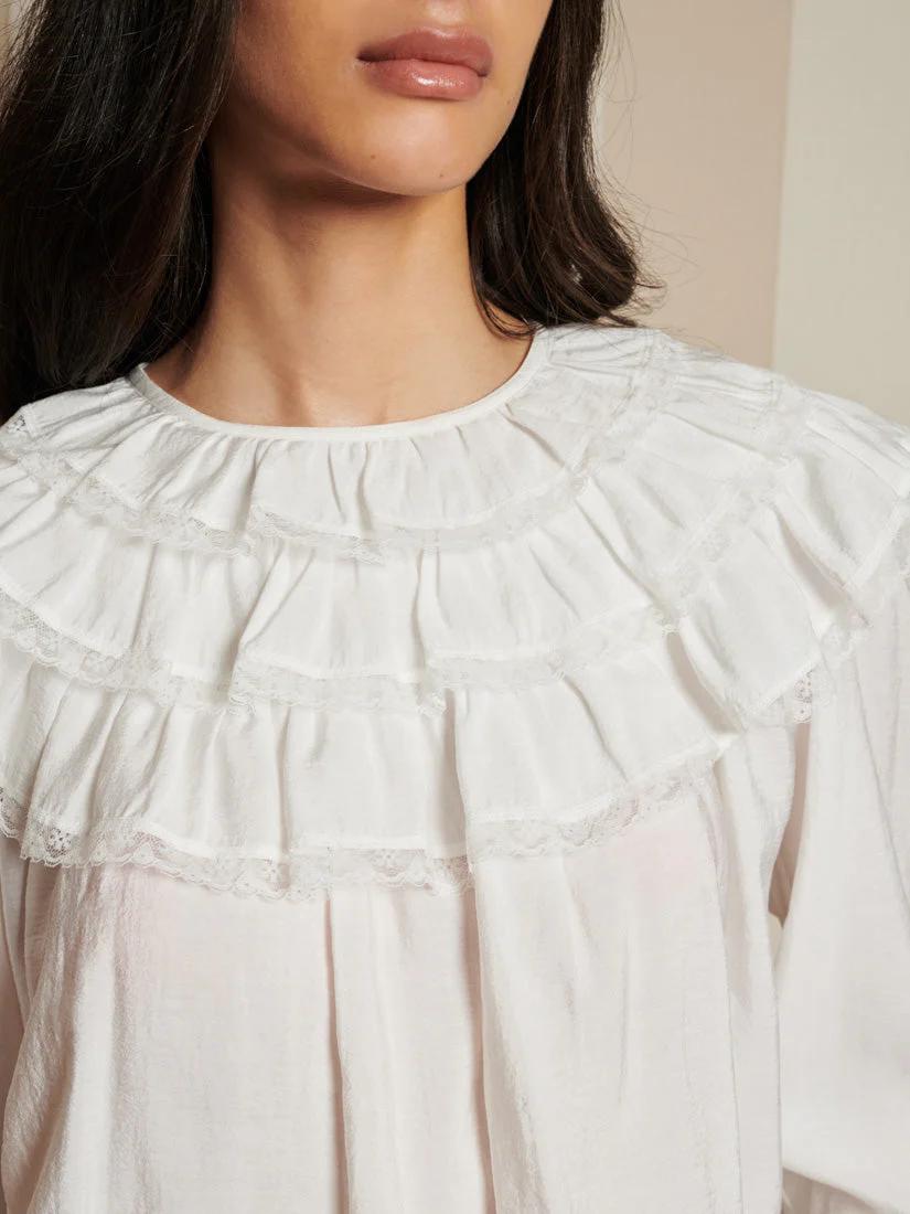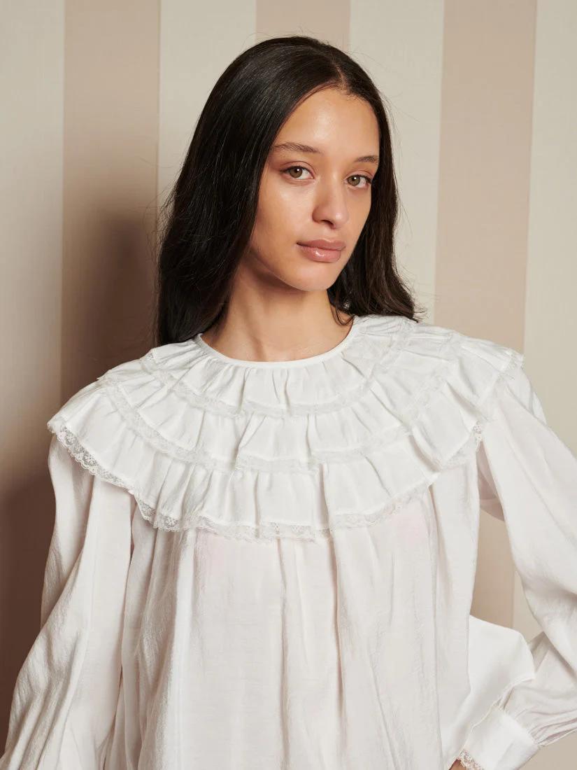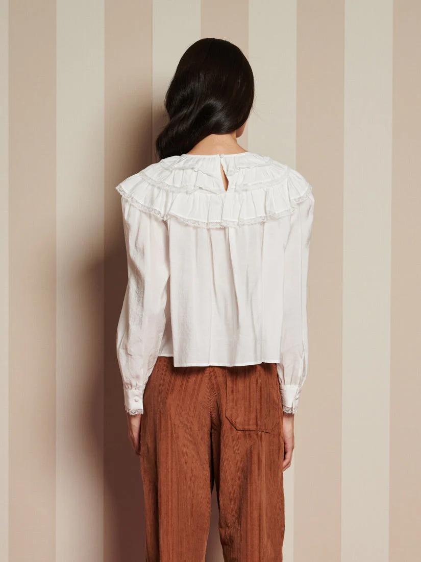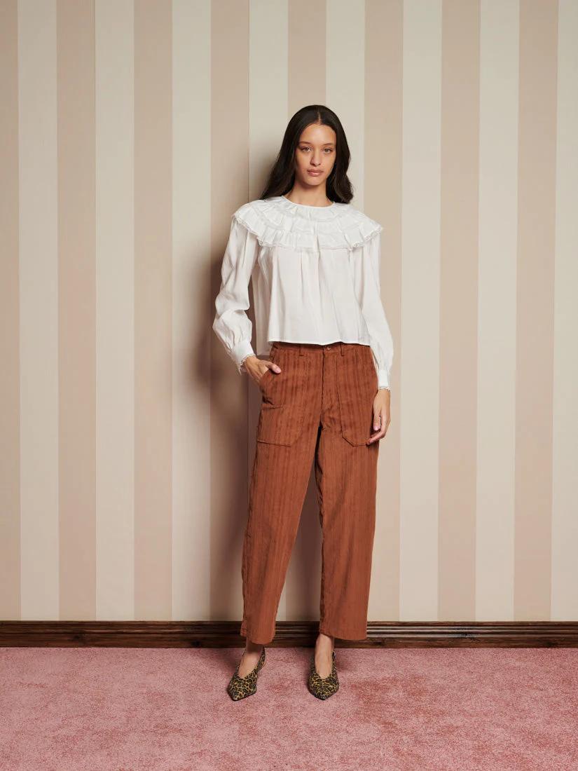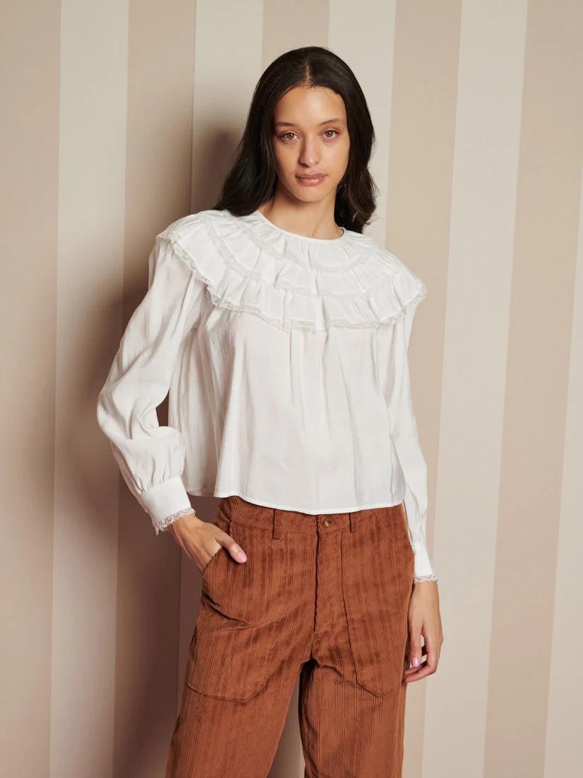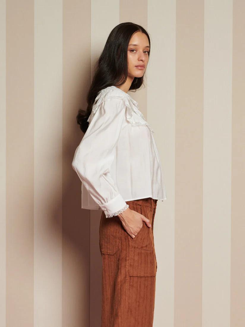 A blouse with a whisper of lace- soft, layered, and as delicate as doilies on a mantelpiece. Effortlessly pairs with the Cameron Cord Trousers.