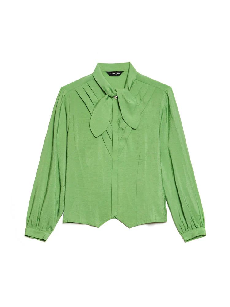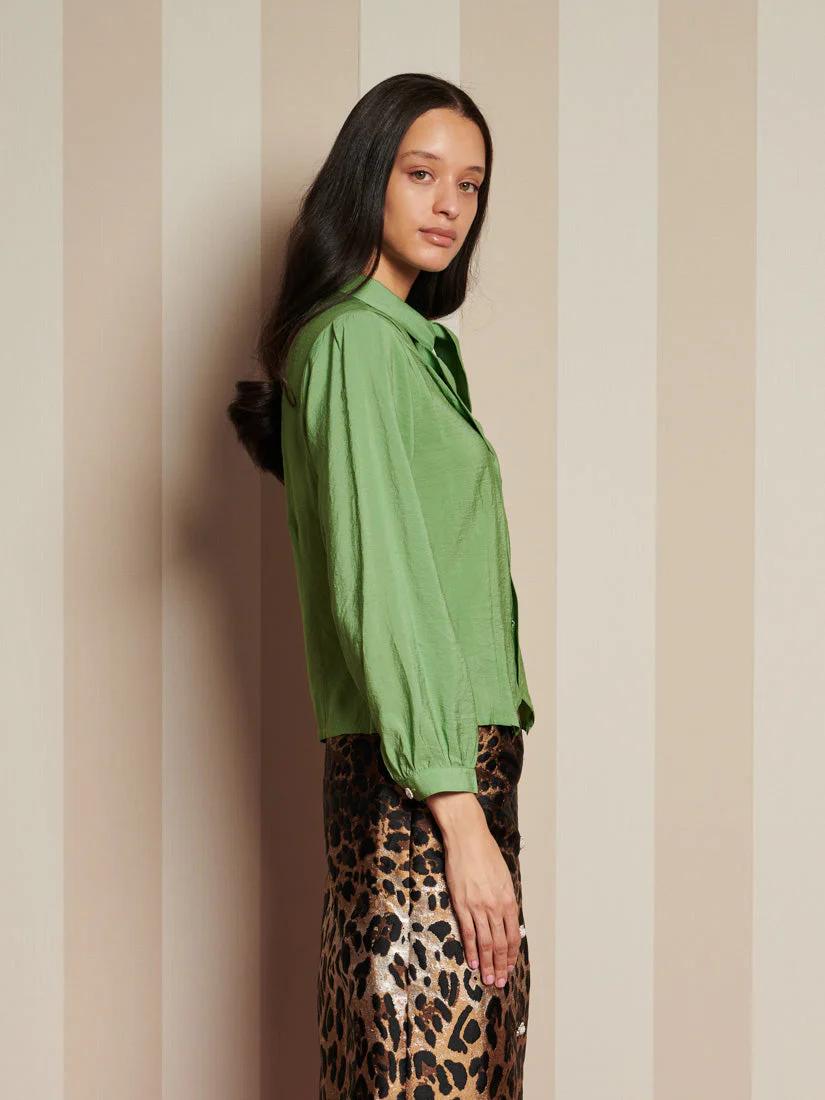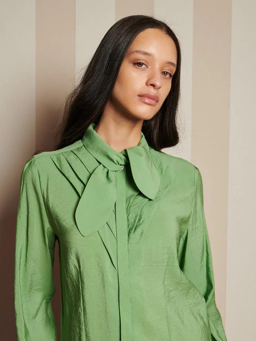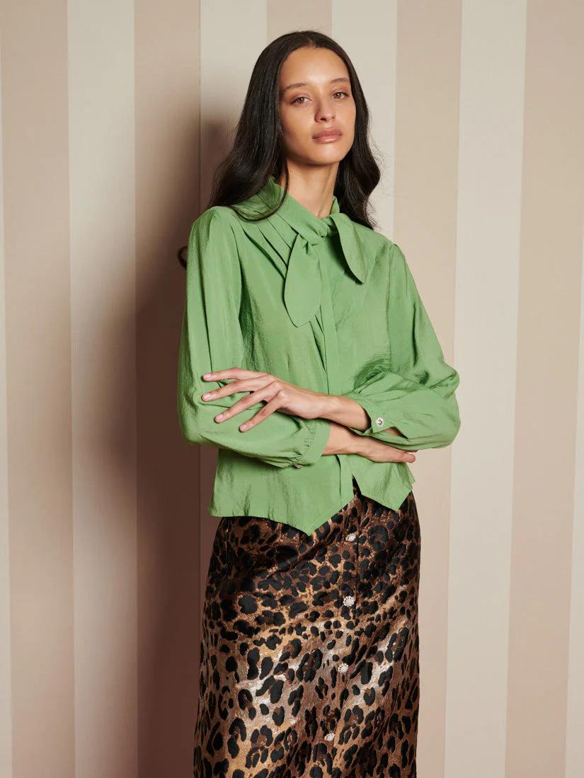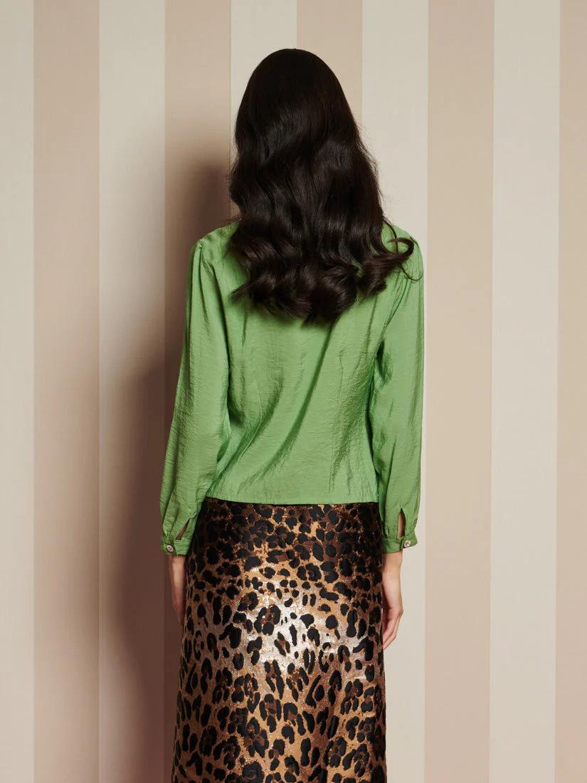 The Paper Pleat Blouse, with its delicate neck tie and subtle pleats, brings the richest green to your everyday-ideal for slow mornings and relaxed afternoons at home. For an even richer look, pair with the Suite Leopard Jacquard Skirt.