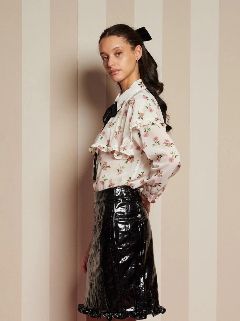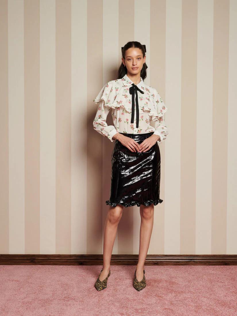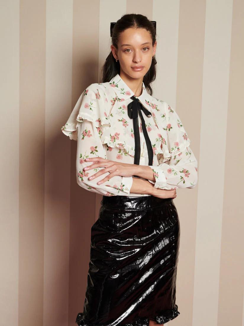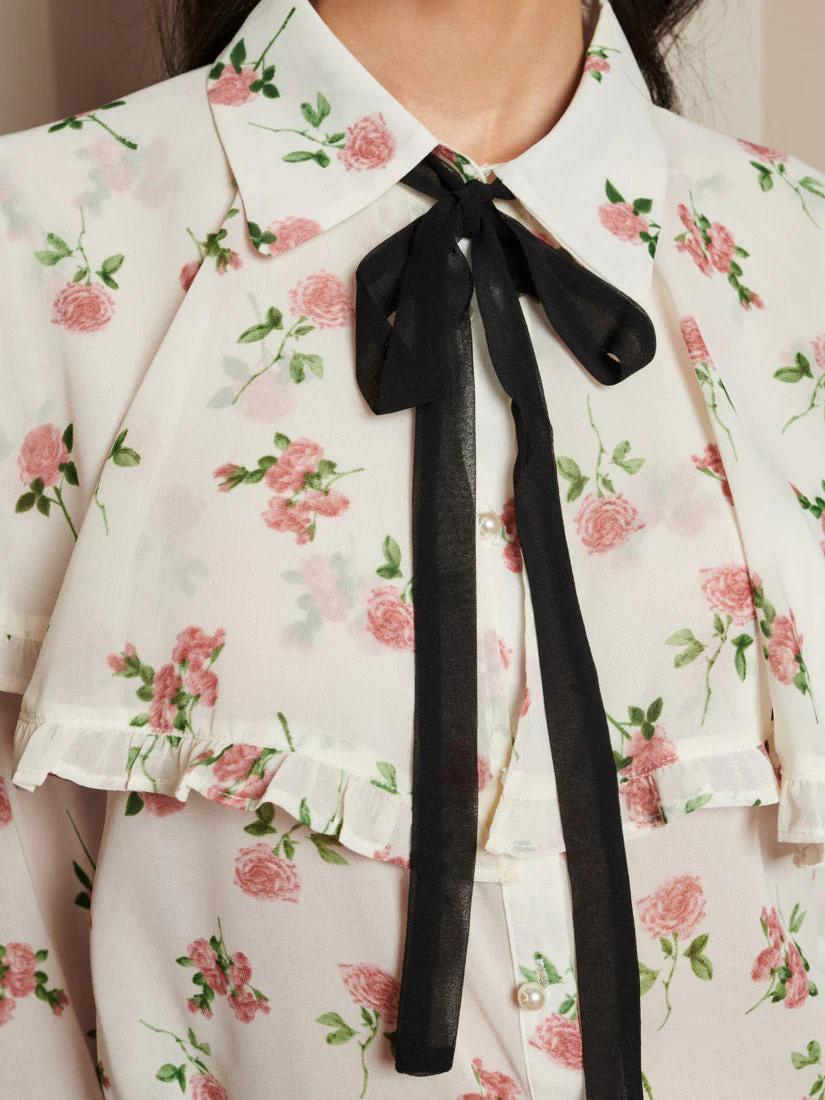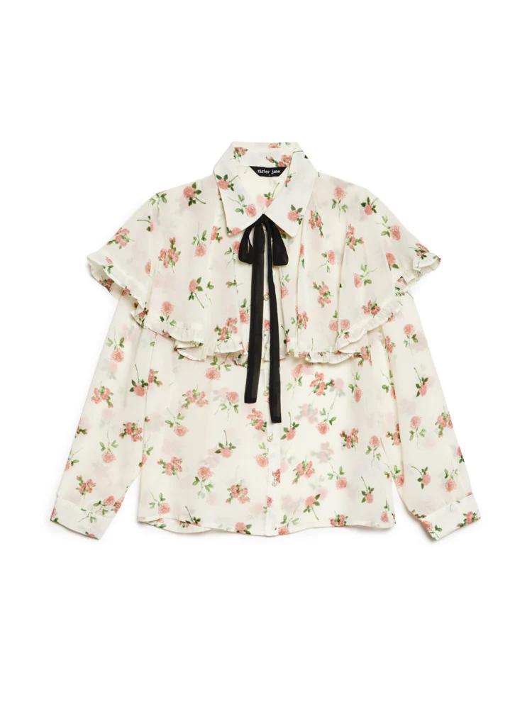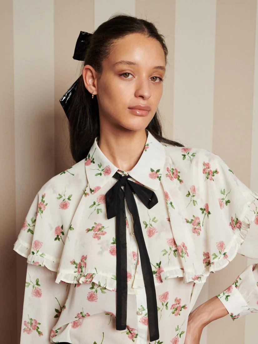 The Bay Flora Cape Blouse is light, flouncy, and fastened with pearls-like a blouse made for playing dress-up.