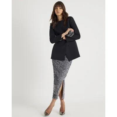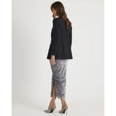 Silver Ruched Side Velvet Sequin Midi Skirt
