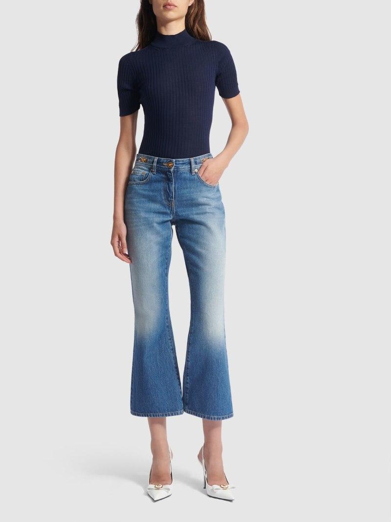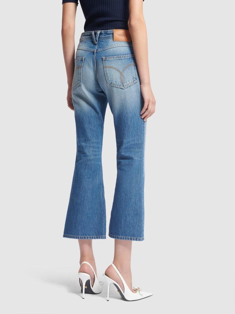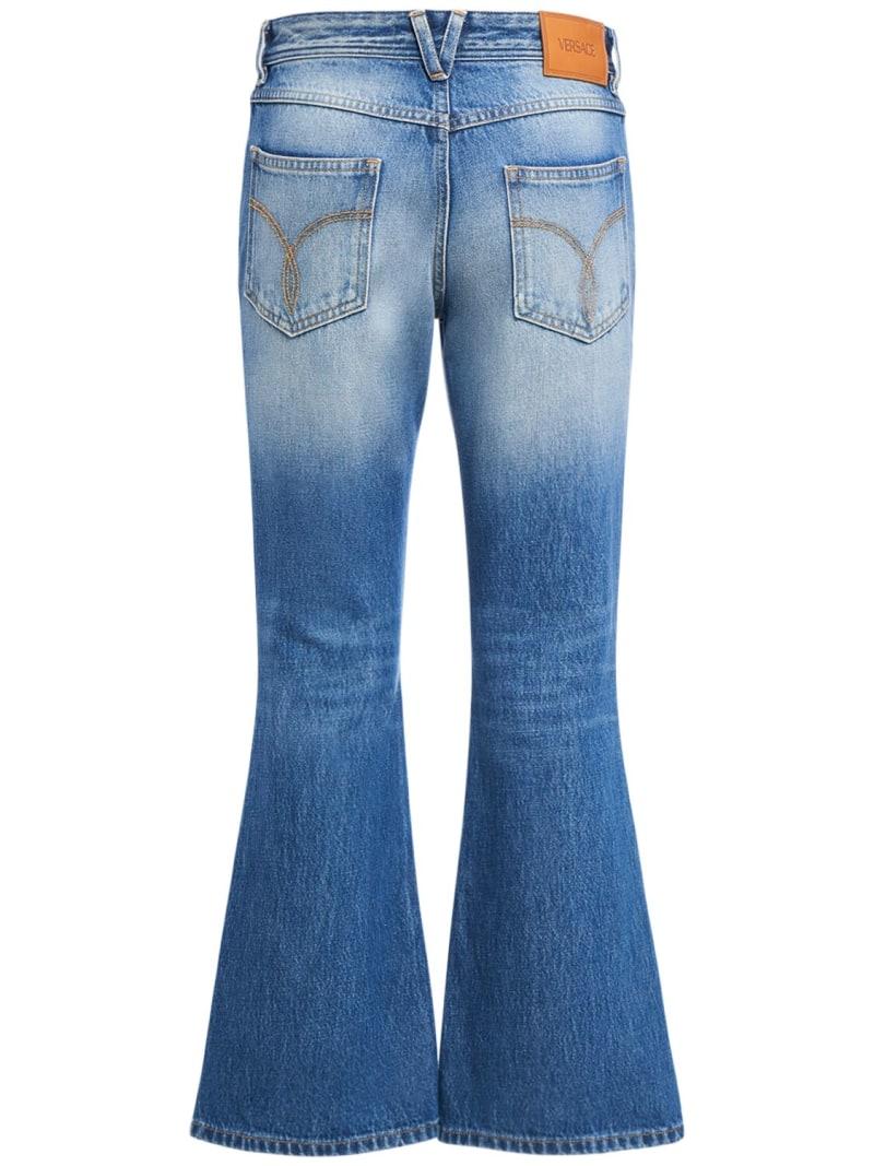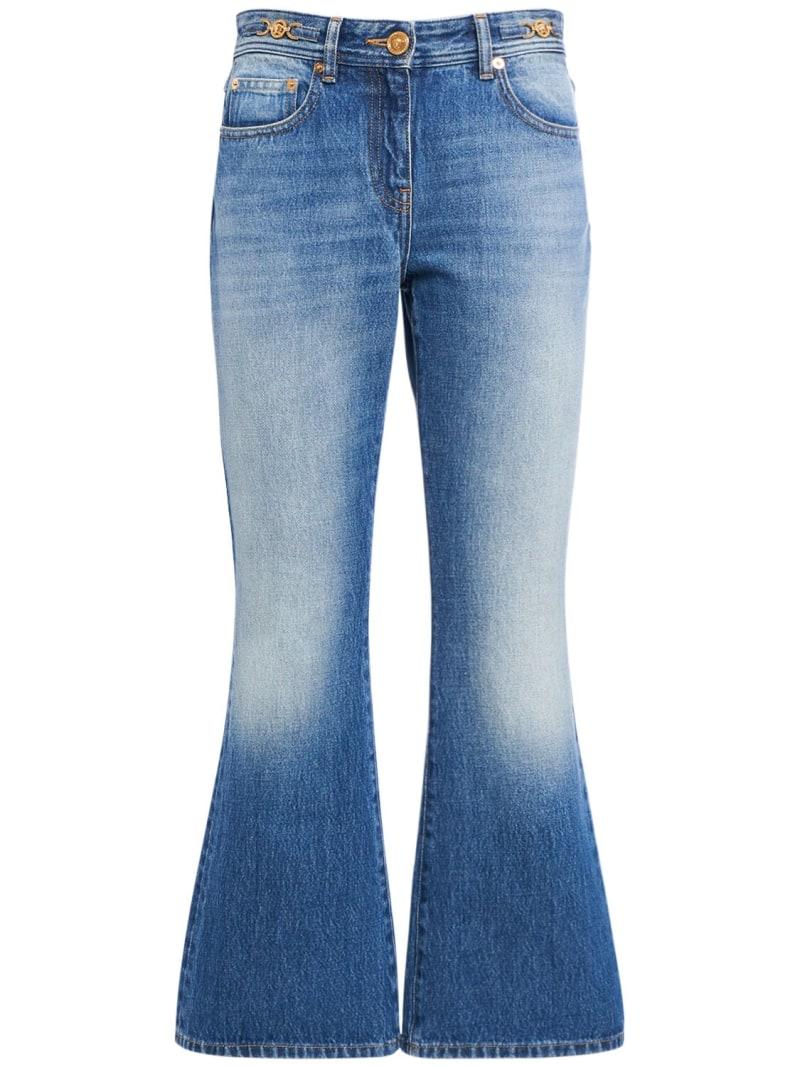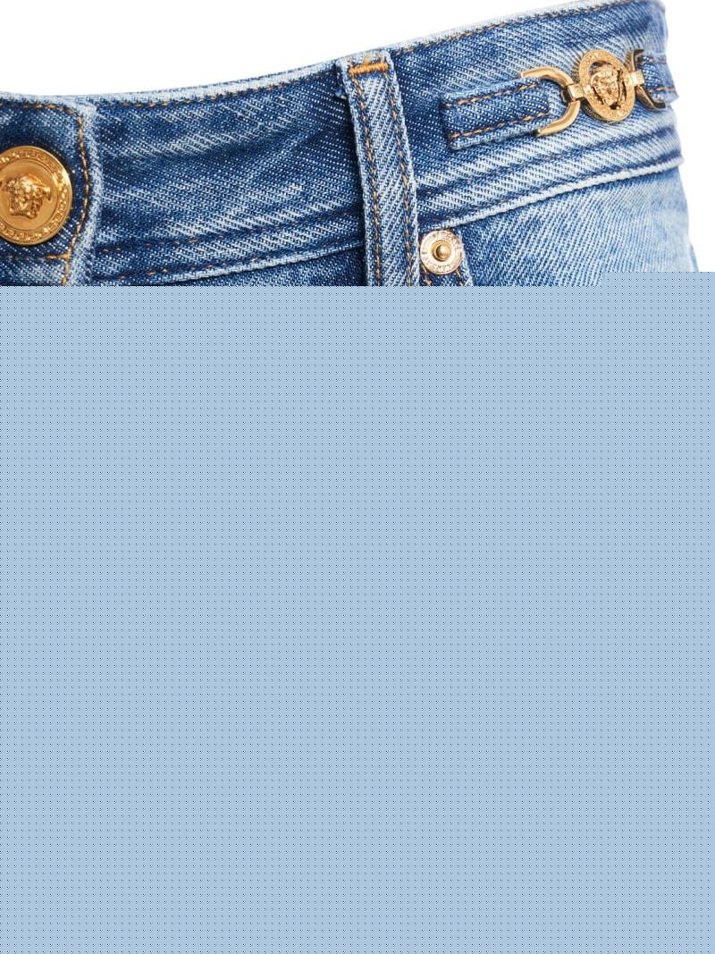 喇叭腿牛仔裤 - 蓝色 - 女士 - Versace - 正面纽扣和隐藏式拉链开合.