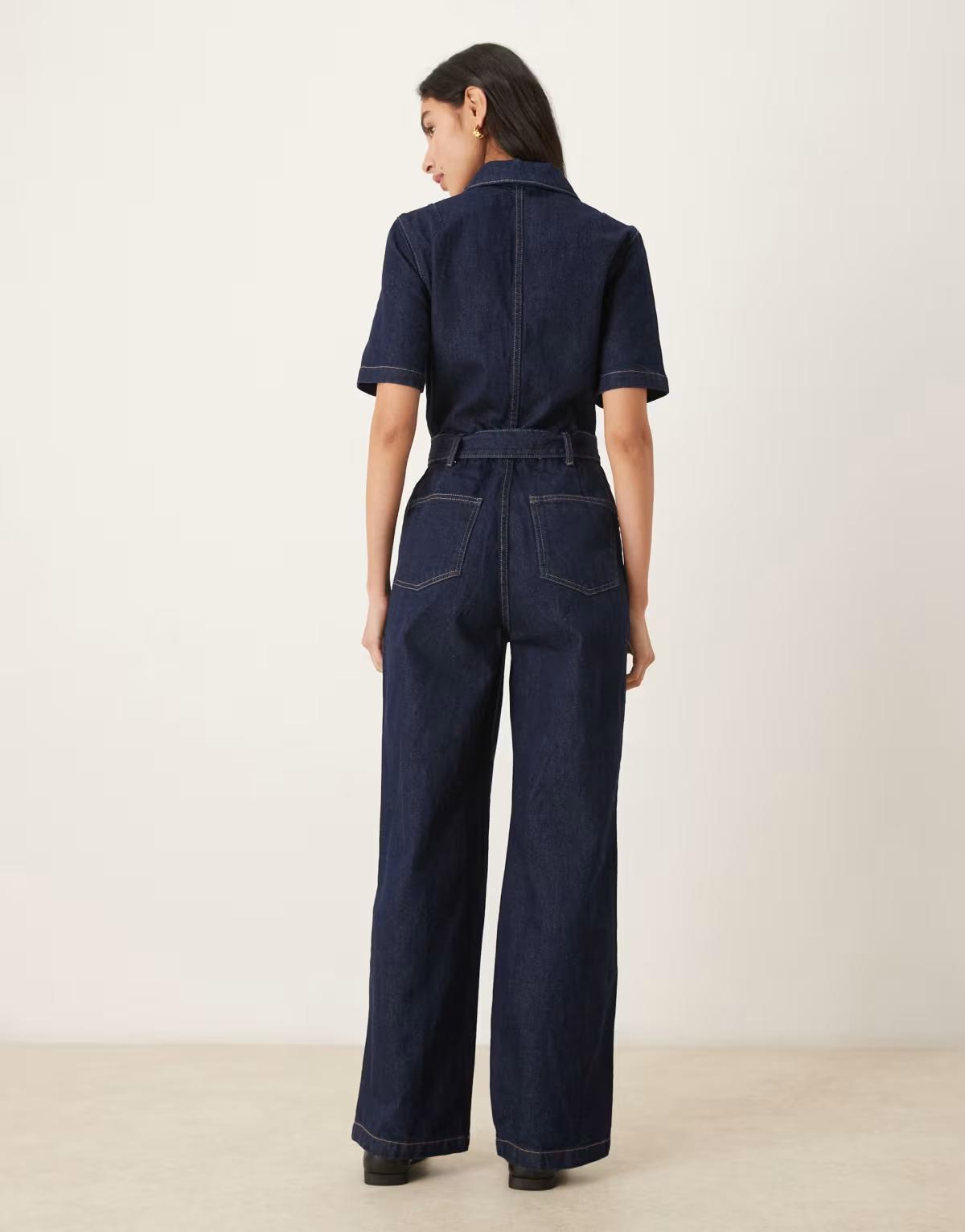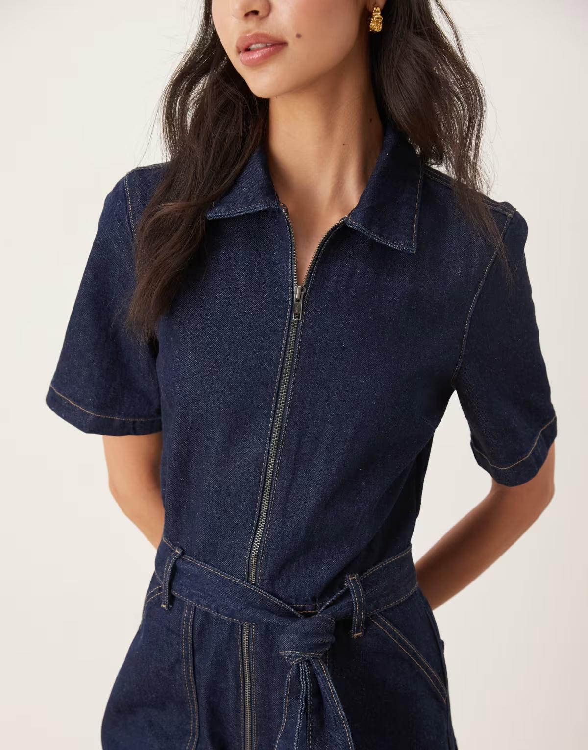 Mango 100% cotton belted short sleeve denim jumpsuit in dark blue