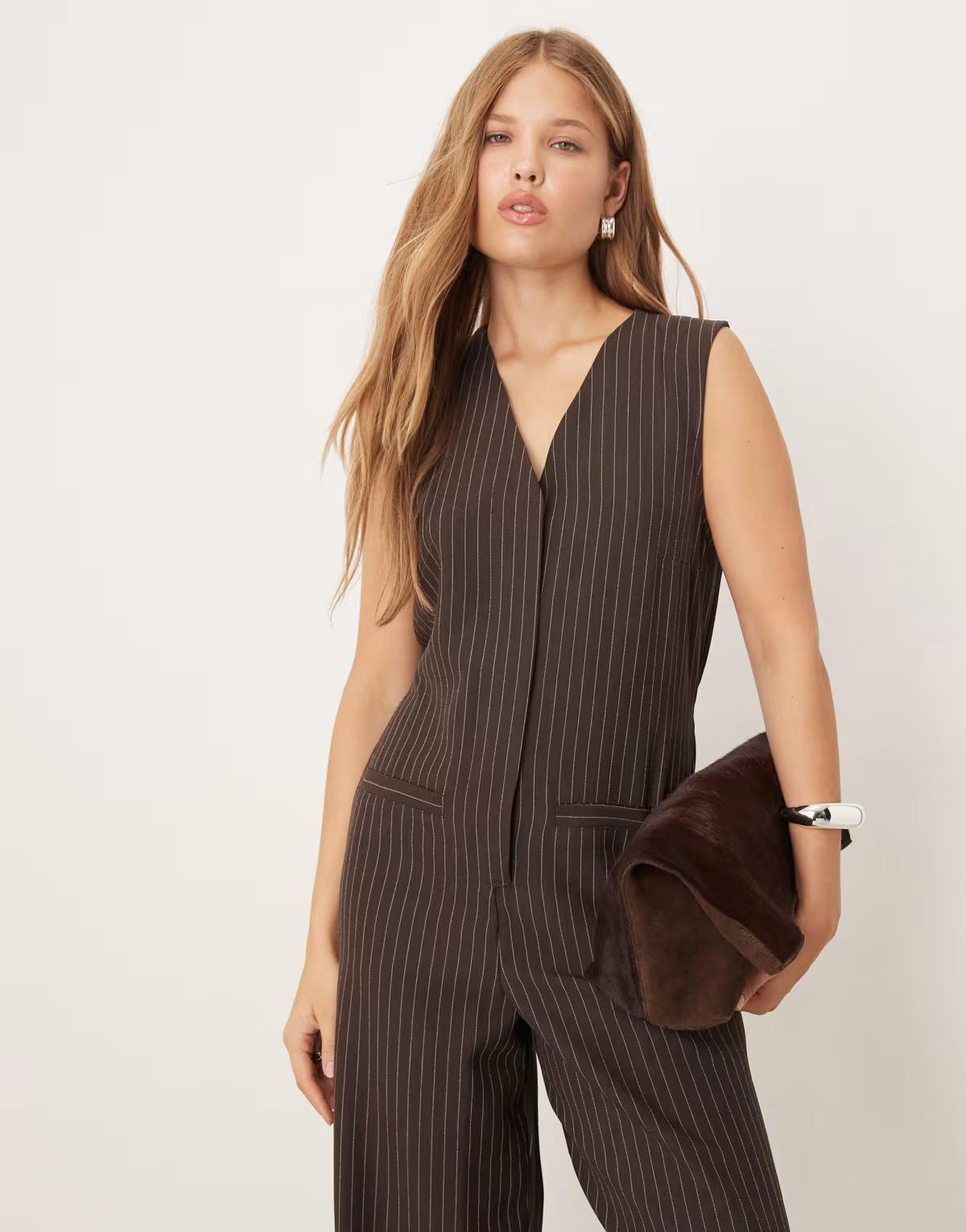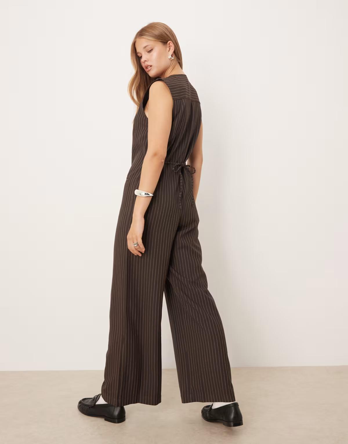 ASOS DESIGN V neck jumpsuit in chocolate pinstripe