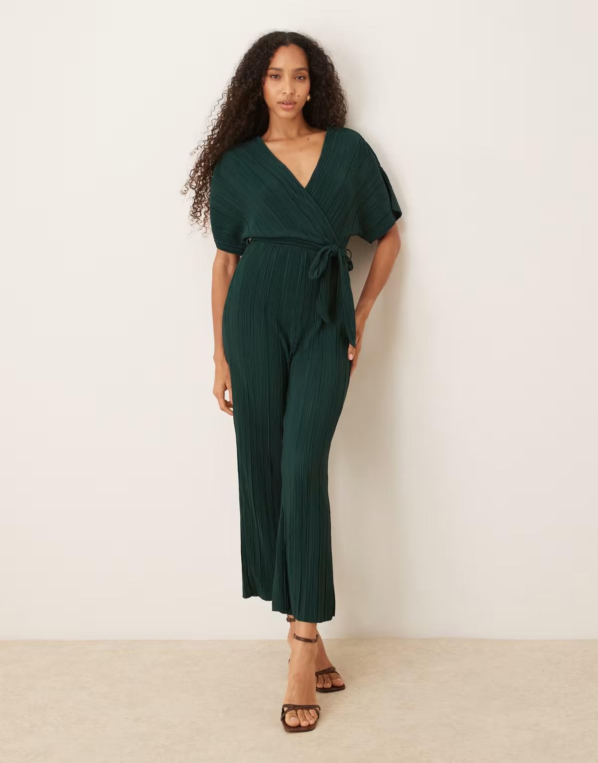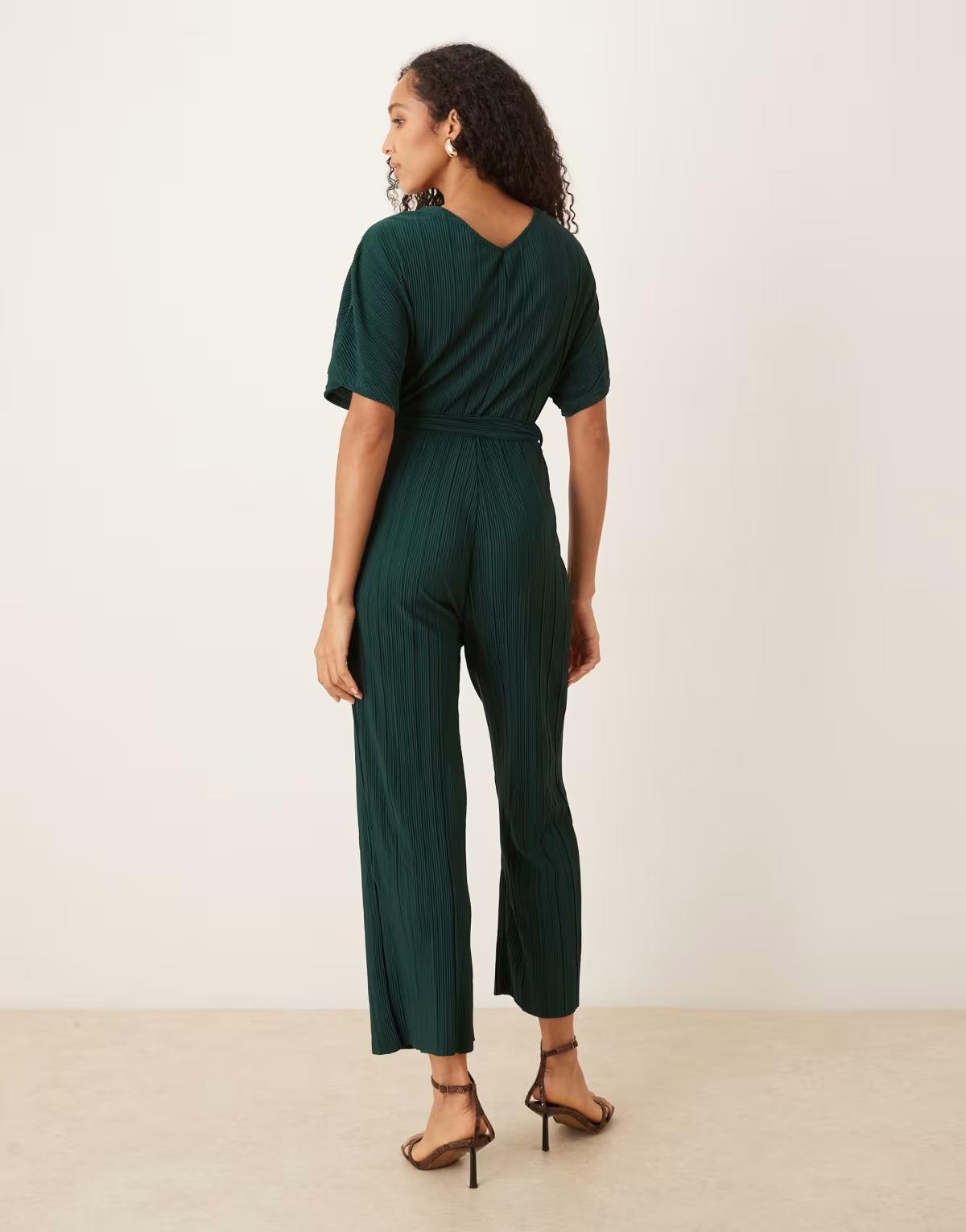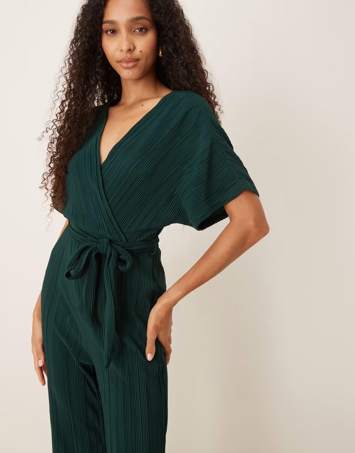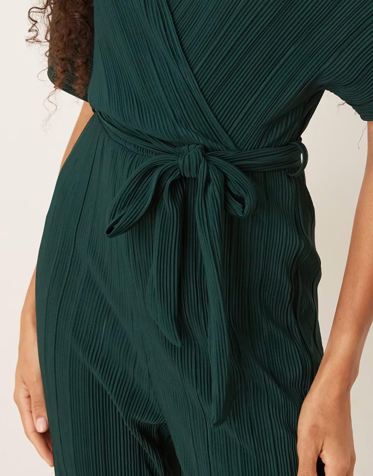 YAS tie waist plisse jumpsuit in deep jewel green