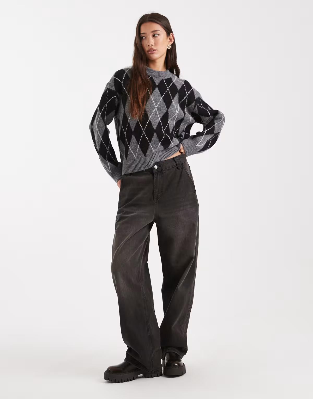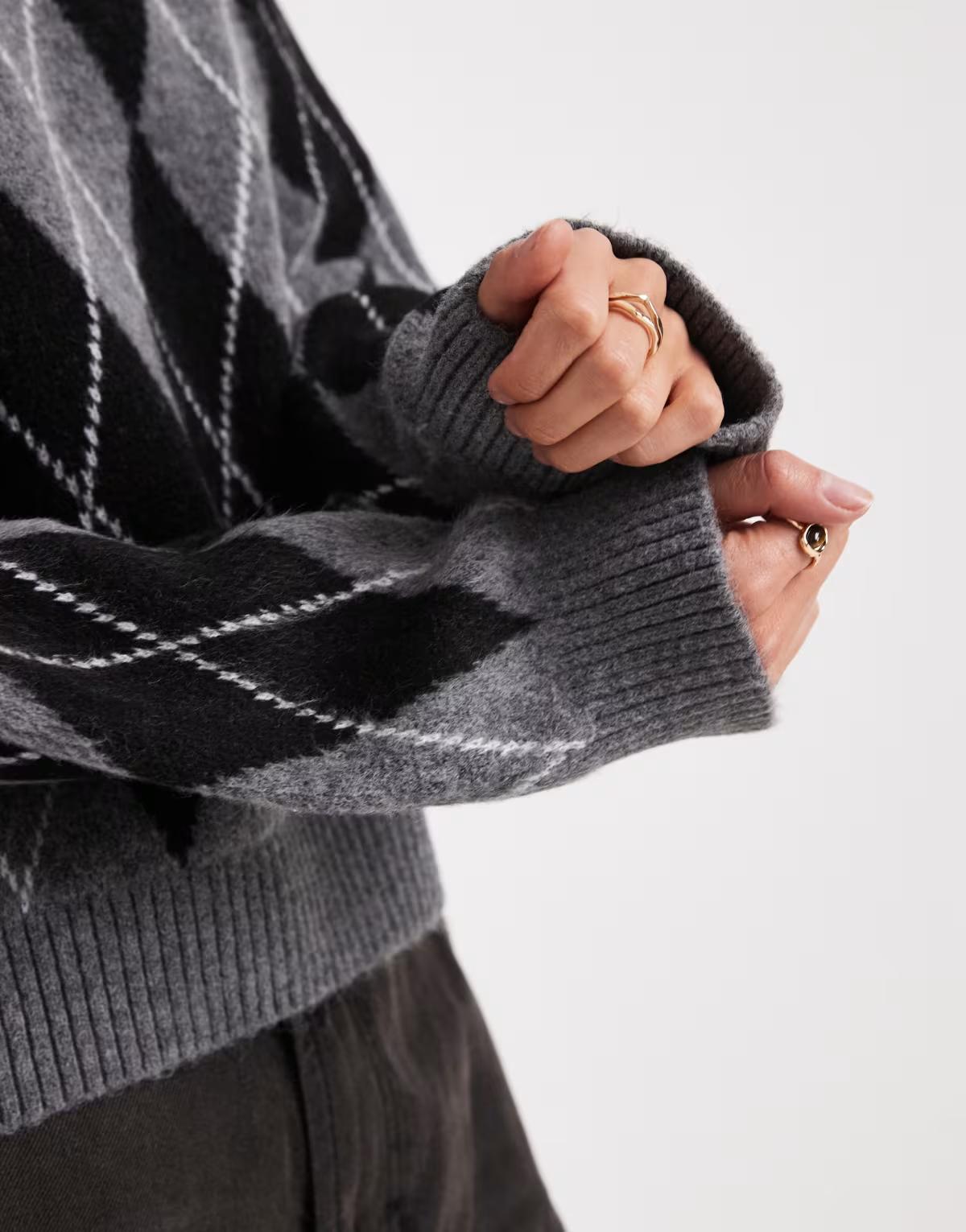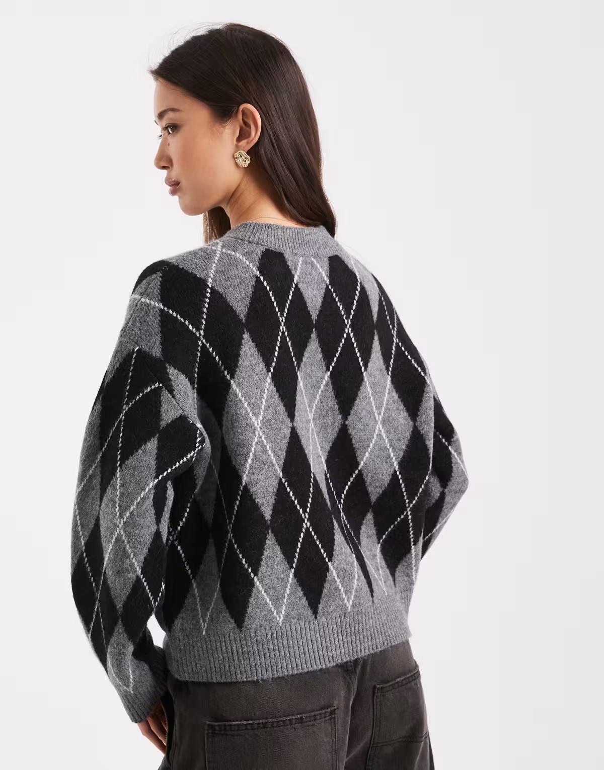 New Look argyle print crew neck jumper in grey