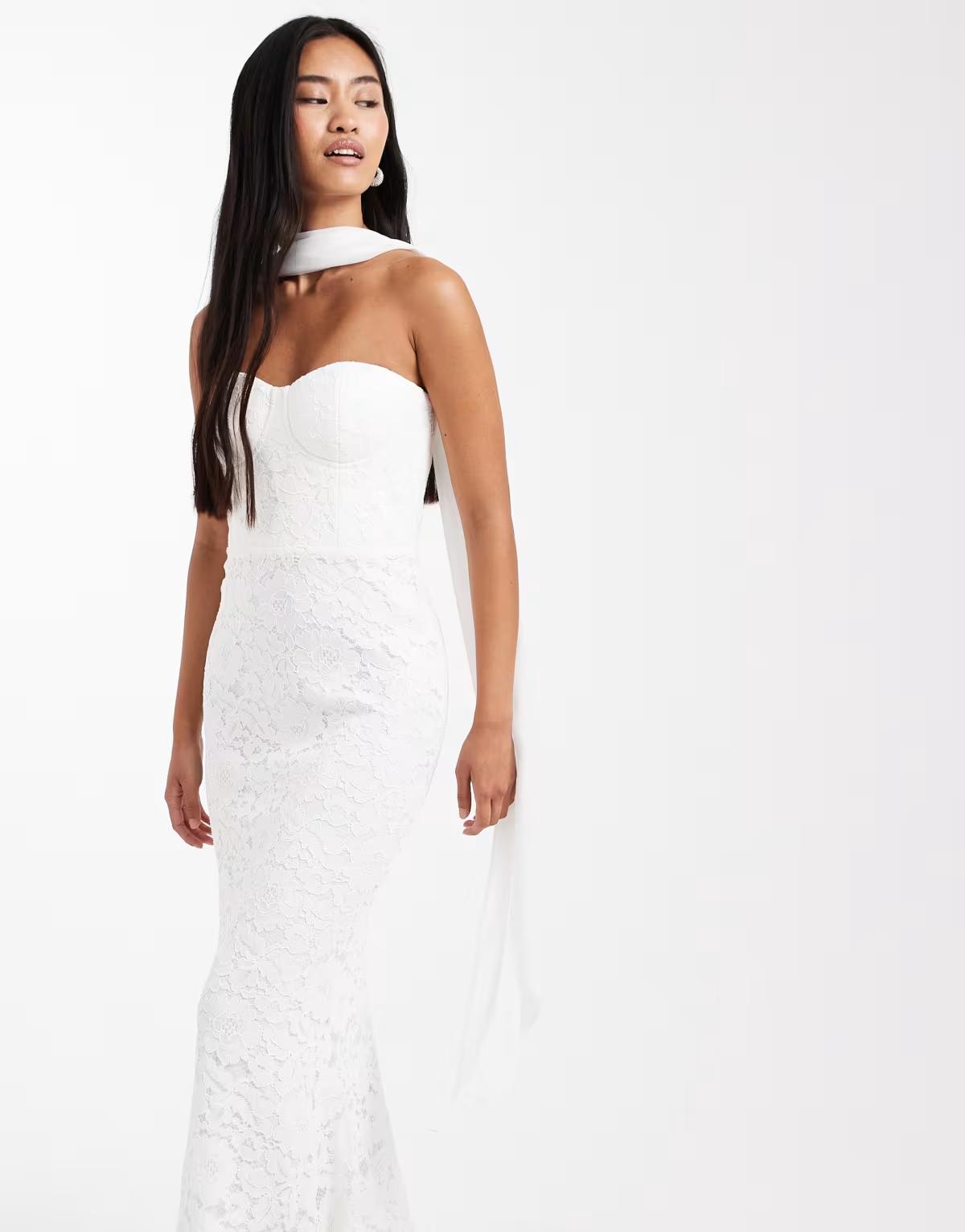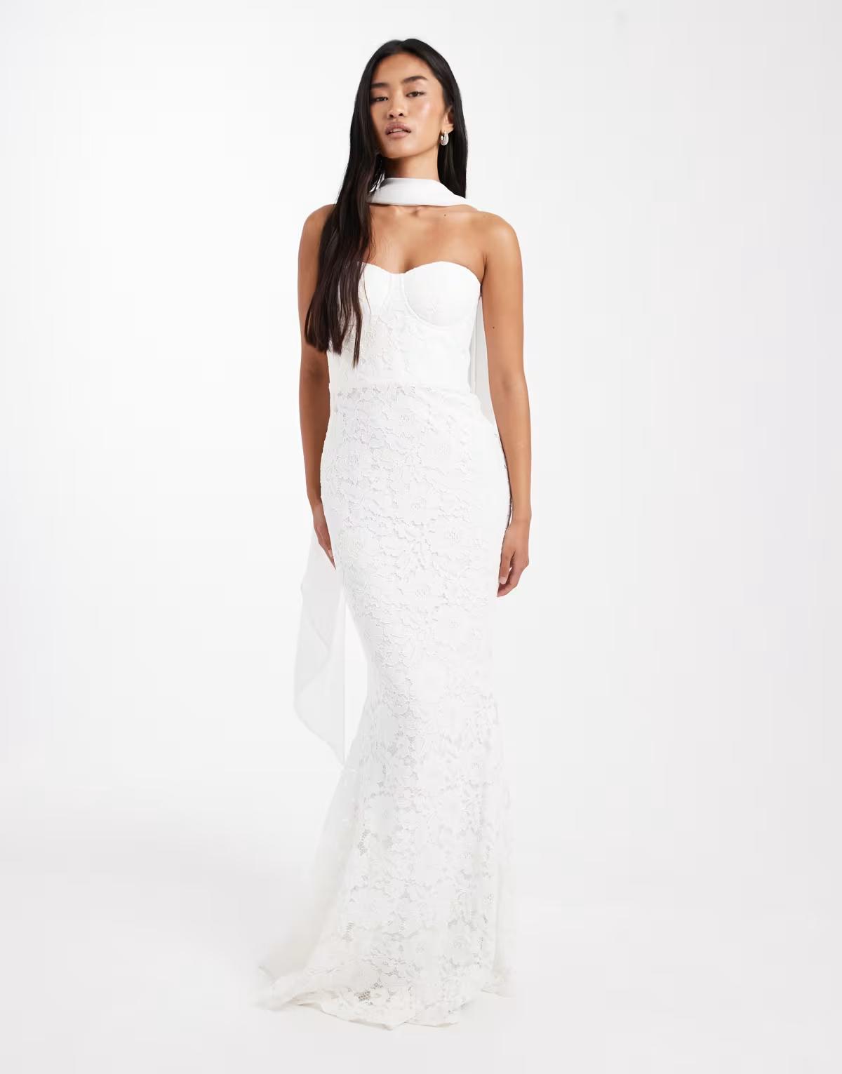 Six Stories Bridal lace bandeau scarf neck maxi dress in white