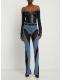 牛仔&蕾丝紧身牛仔裤 - Med Blue/Black - 女士 - MUGLER - 正面纽扣和隐藏式拉链开合.