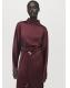 Tejido satinado. Diseño midi. Diseño recto. Cuello alto. Manga larga. Cinturón ajustable. Abertura en el bajo. Cierre de cremallera en la parte posterior