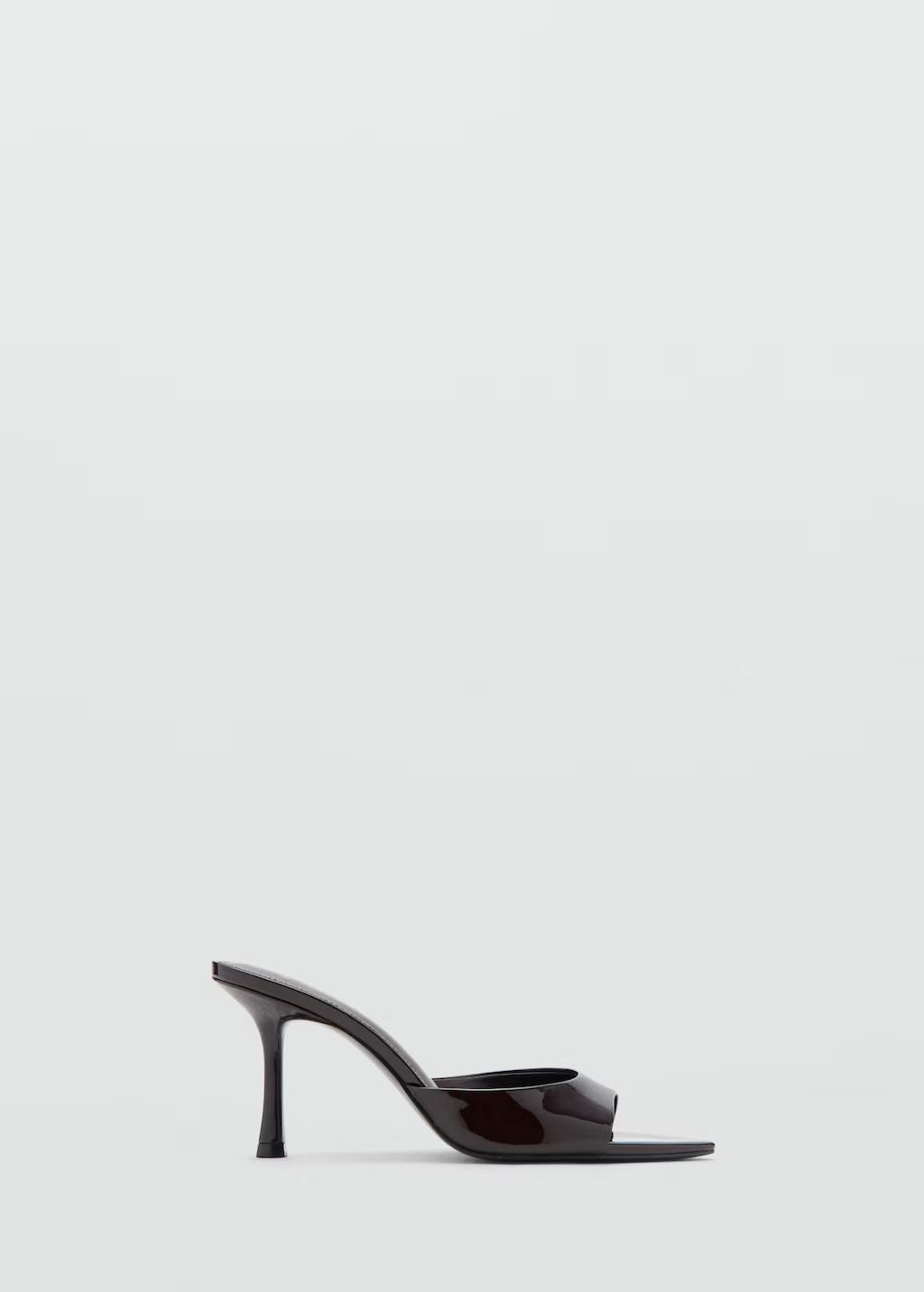 Efecto charol. Diseño destalonado. Diseño de tira. Puntera abierta. Tacón de aguja. Sin cierre. El tacón mide 8 cm